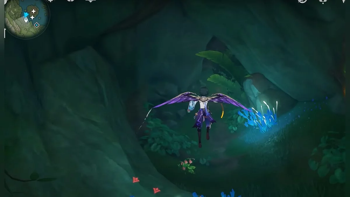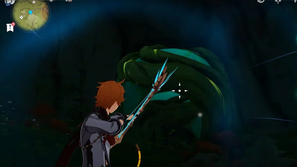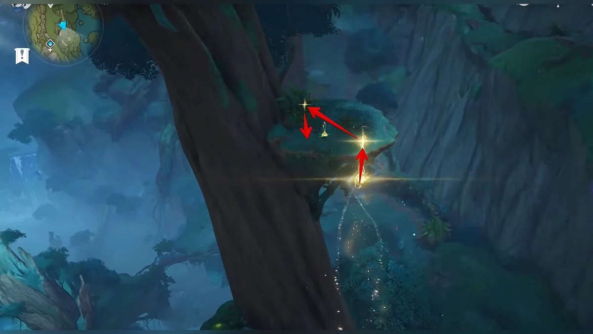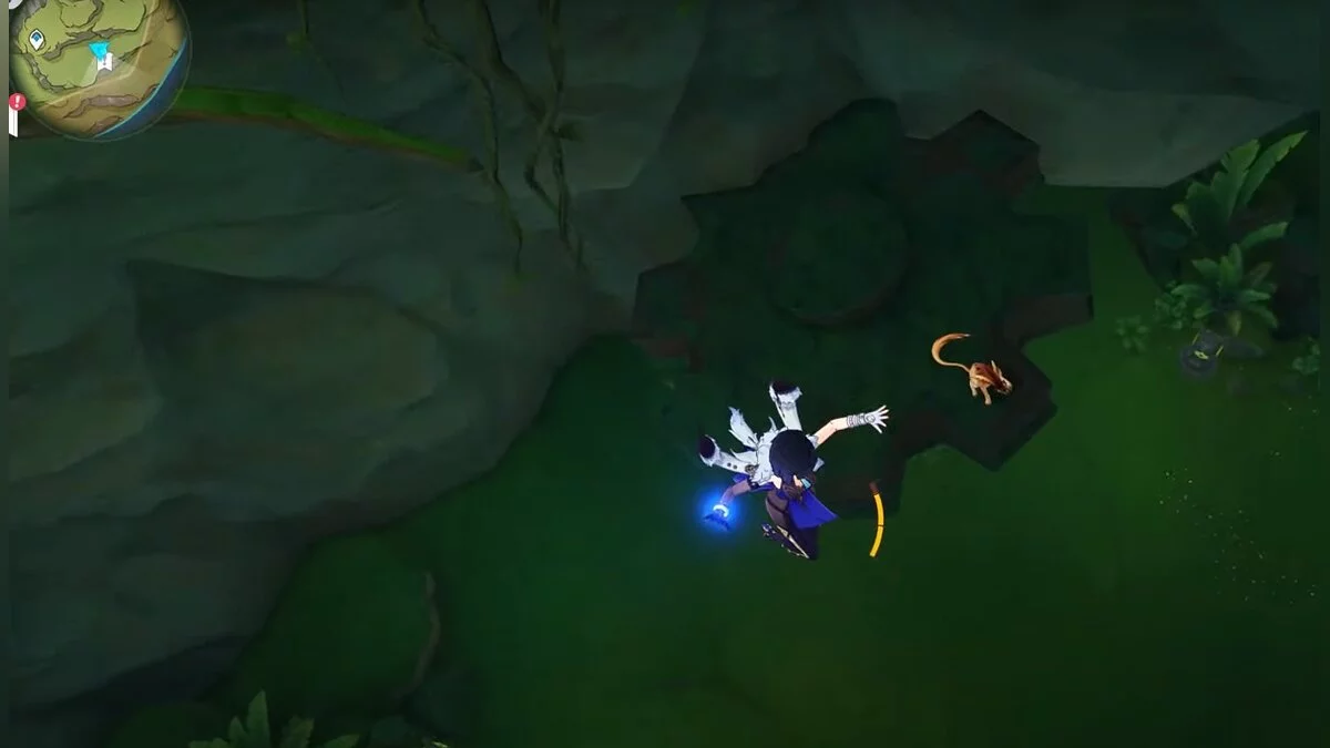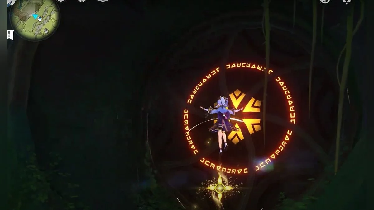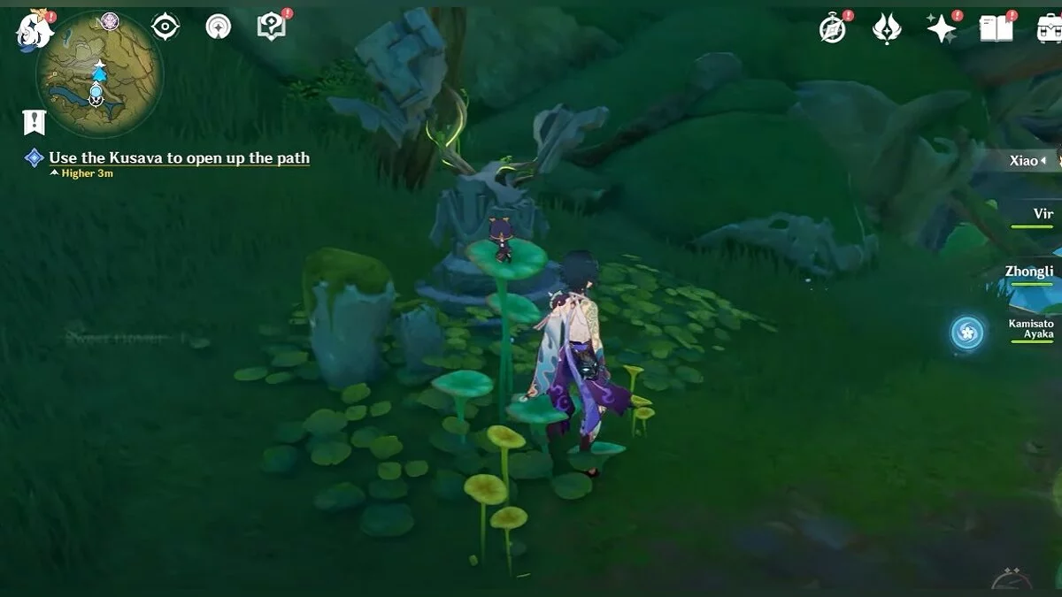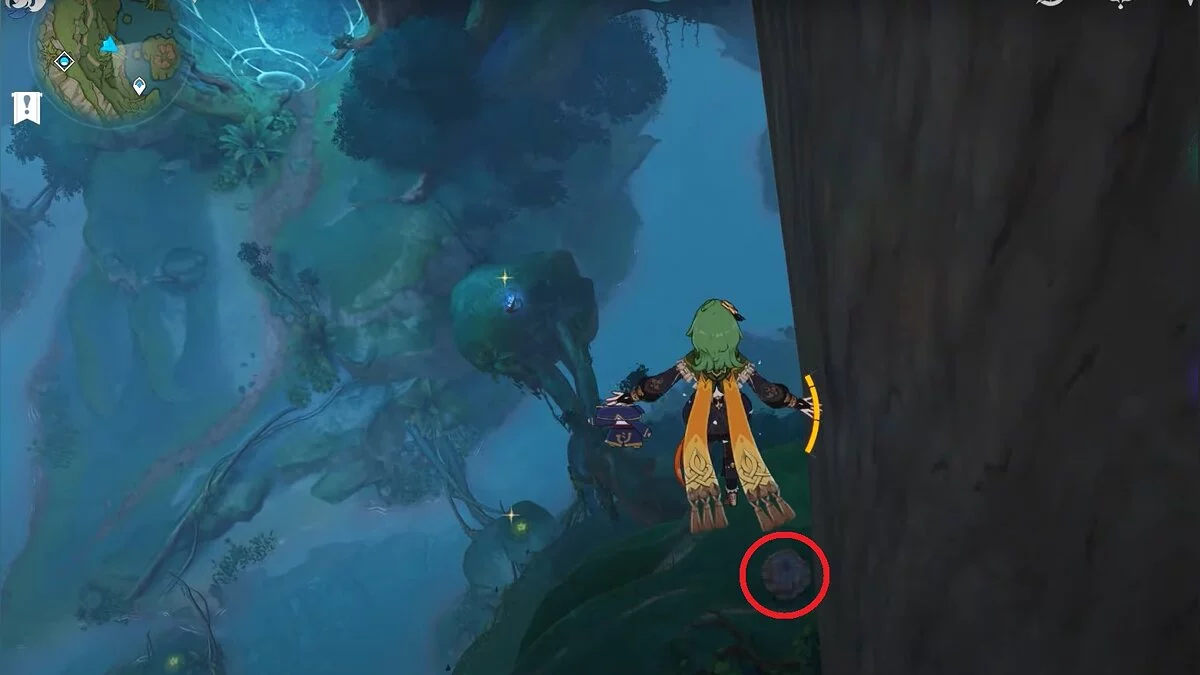 Бегите вперёд и активируйте телепорт. Пещера поделена на три уровня, но нижний уровень затоплен. На среднем уровне вы увидите статую стихии Дендро, которая заблокирована печатью. Чтобы открыть к ней доступ, призовите дендрогранумы (или используйте персонажа стихии Дендро), затем уничтожьте несколько заражённых ветвей и цветков.