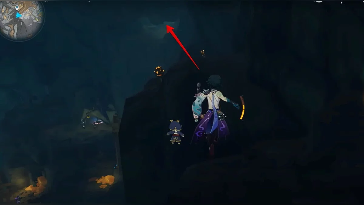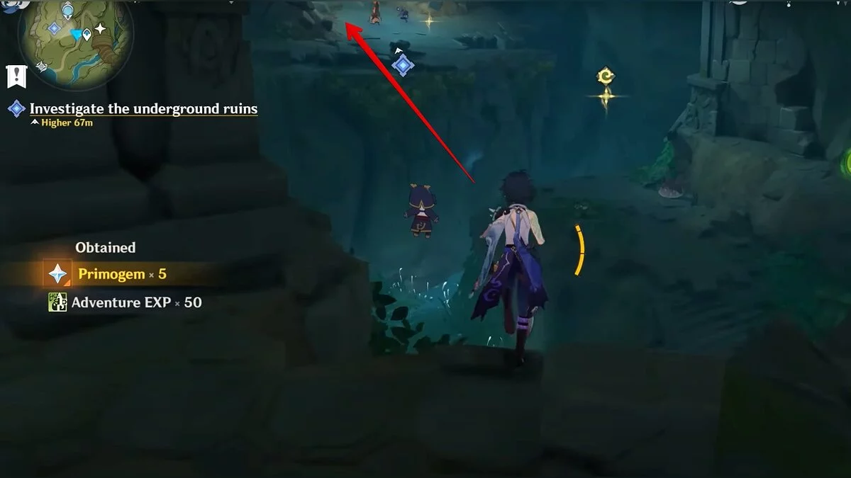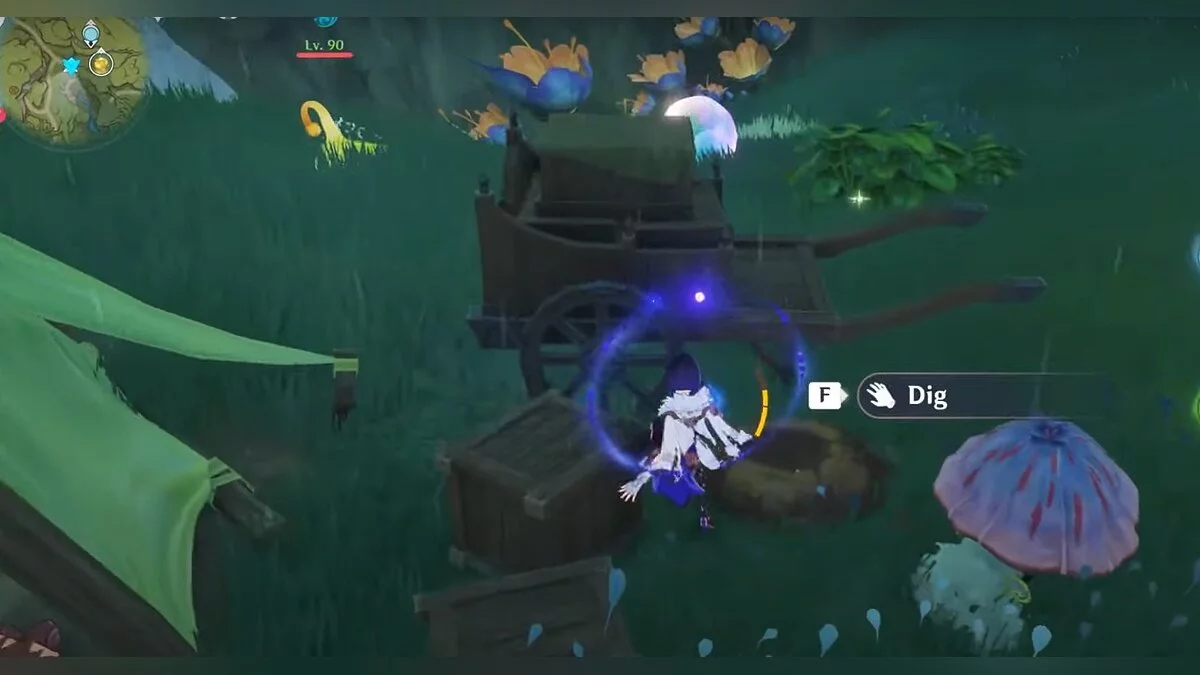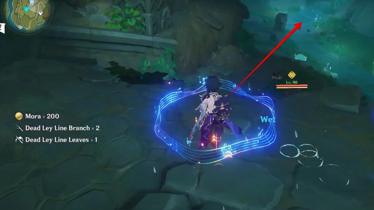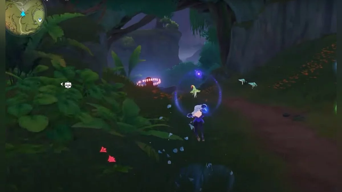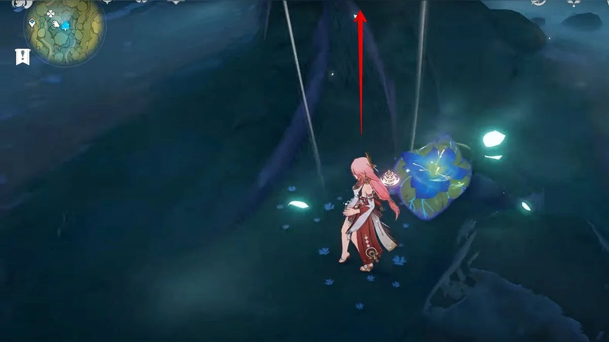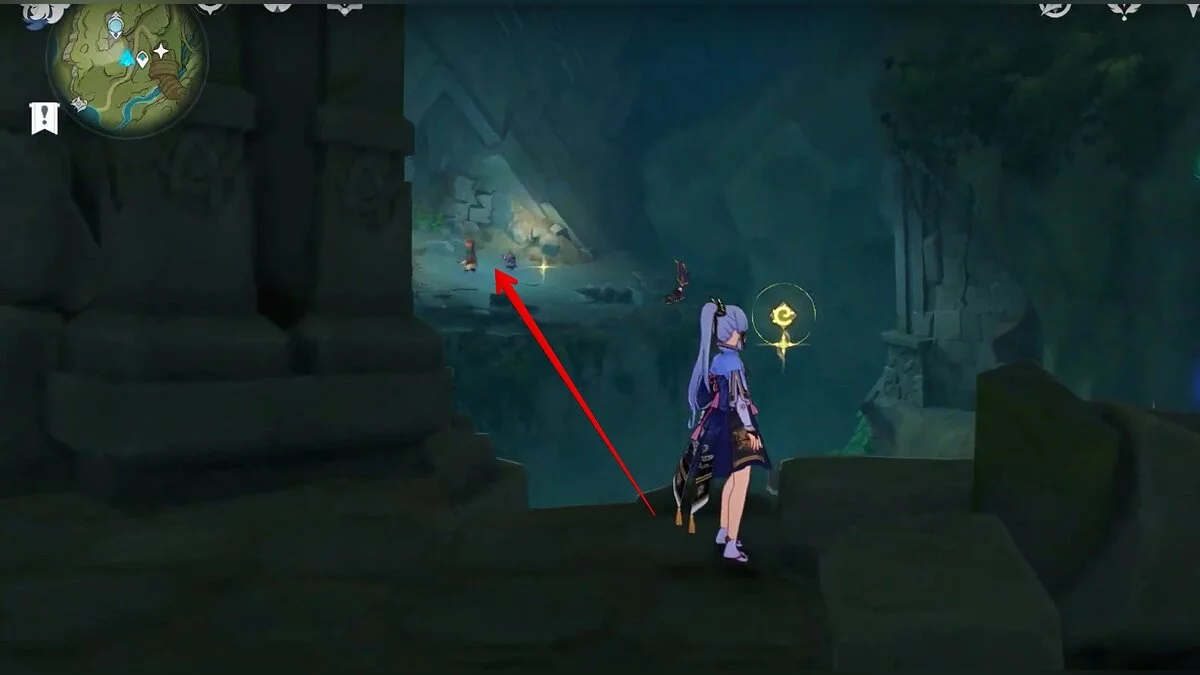 Бегите вперёд и активируйте телепорт. Пещера поделена на три уровня, но нижний уровень затоплен. На среднем уровне вы увидите статую стихии Дендро, которая заблокирована печатью. Чтобы открыть к ней доступ, призовите дендрогранумы (или используйте персонажа стихии Дендро), затем уничтожьте несколько заражённых ветвей и цветков.