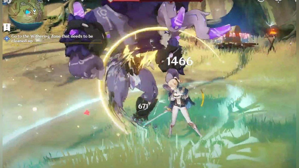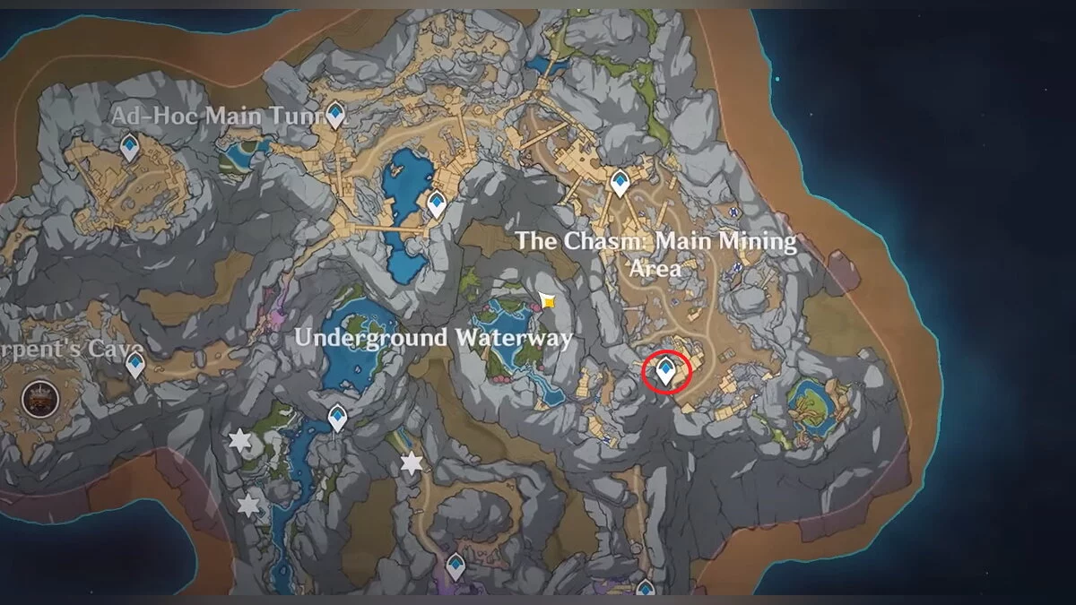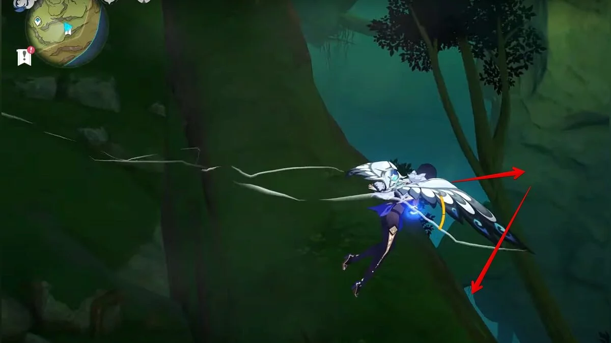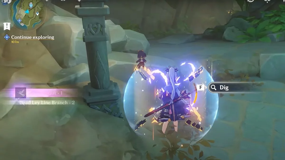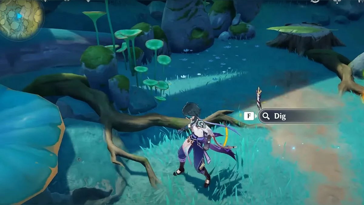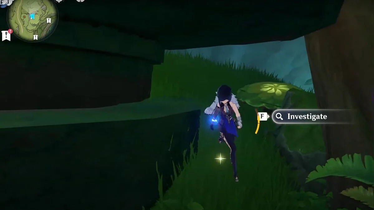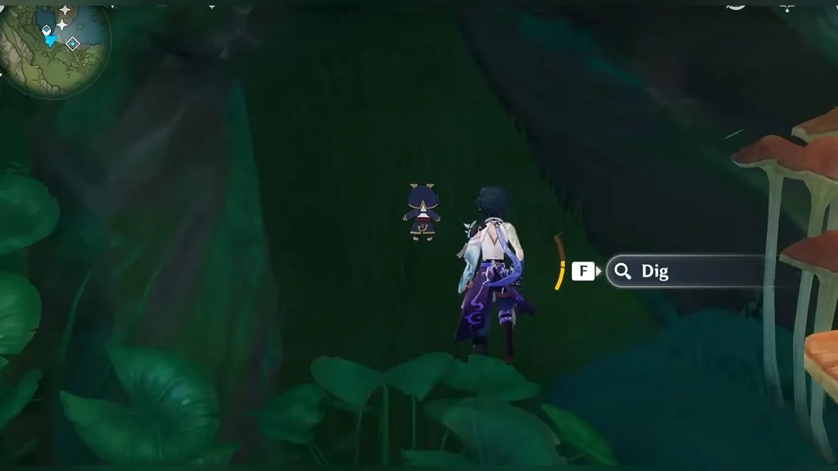 Бегите вперёд и активируйте телепорт. Пещера поделена на три уровня, но нижний уровень затоплен. На среднем уровне вы увидите статую стихии Дендро, которая заблокирована печатью. Чтобы открыть к ней доступ, призовите дендрогранумы (или используйте персонажа стихии Дендро), затем уничтожьте несколько заражённых ветвей и цветков.