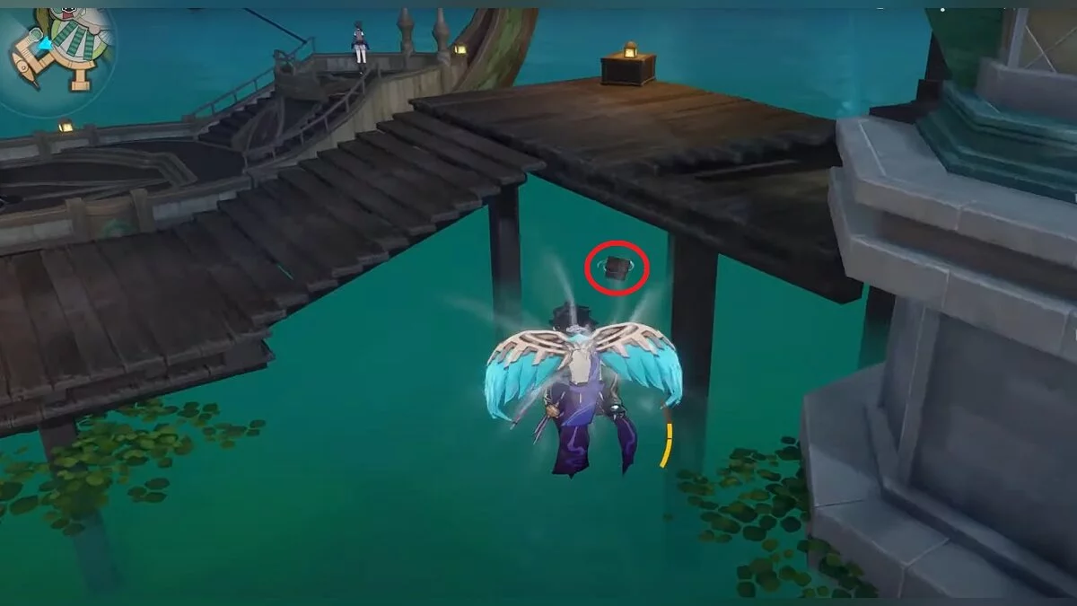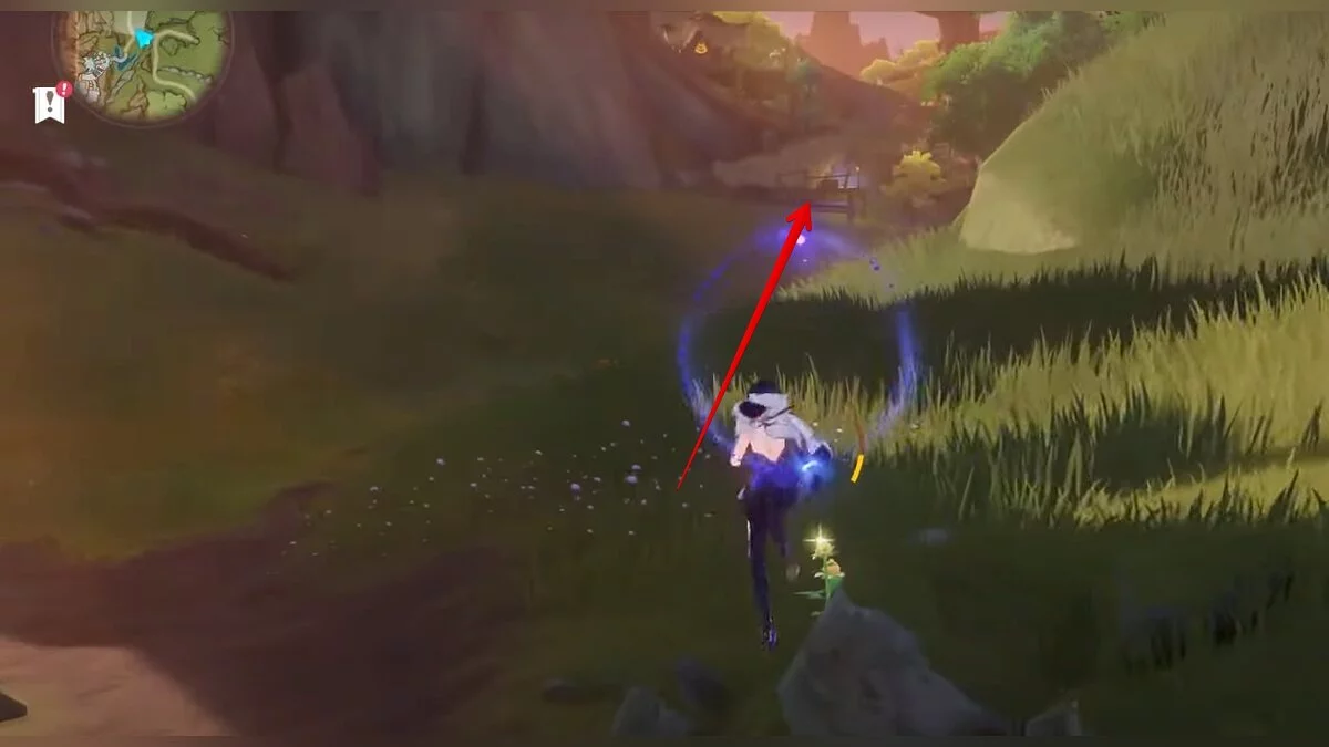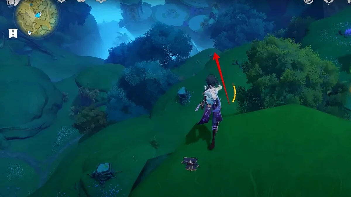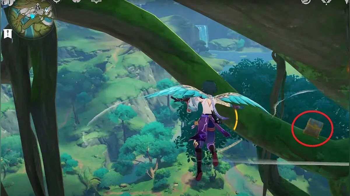Двигайтесь дальше на запад. Активируйте жёлтый цветок ударом дендро-стихии, прыгайте по меткам, чтобы перебраться через пропасть. Возле палатки находится третий сундук.