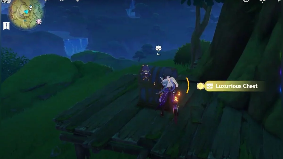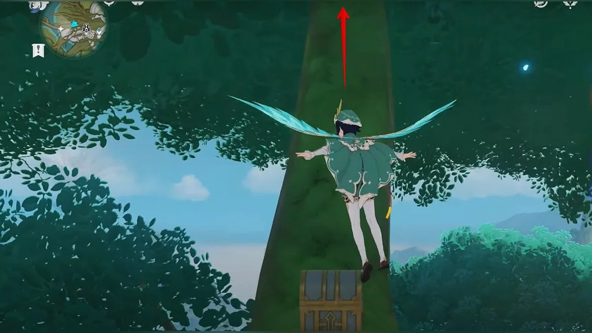 Поднимайтесь выше. Рядом со светящейся травой поворачивайте налево. Прыгайте и в полёте поворачивайте направо. На одной из веток вы увидите первый роскошный сундук.