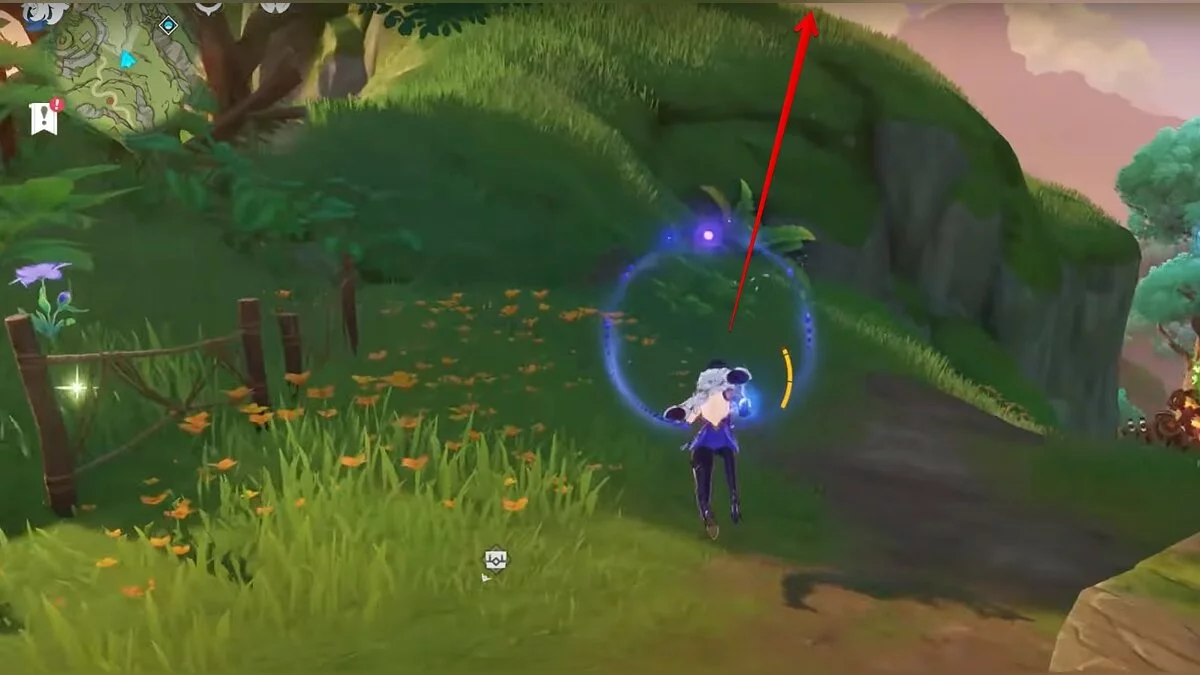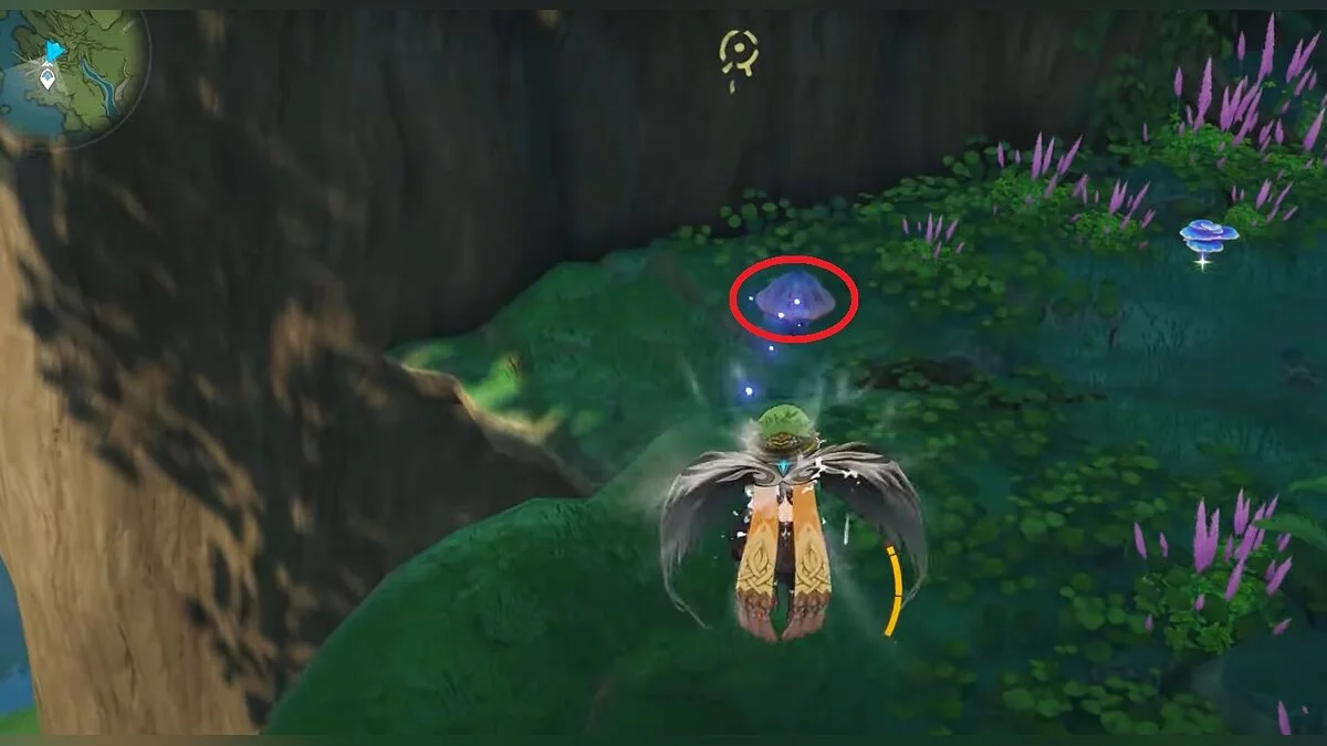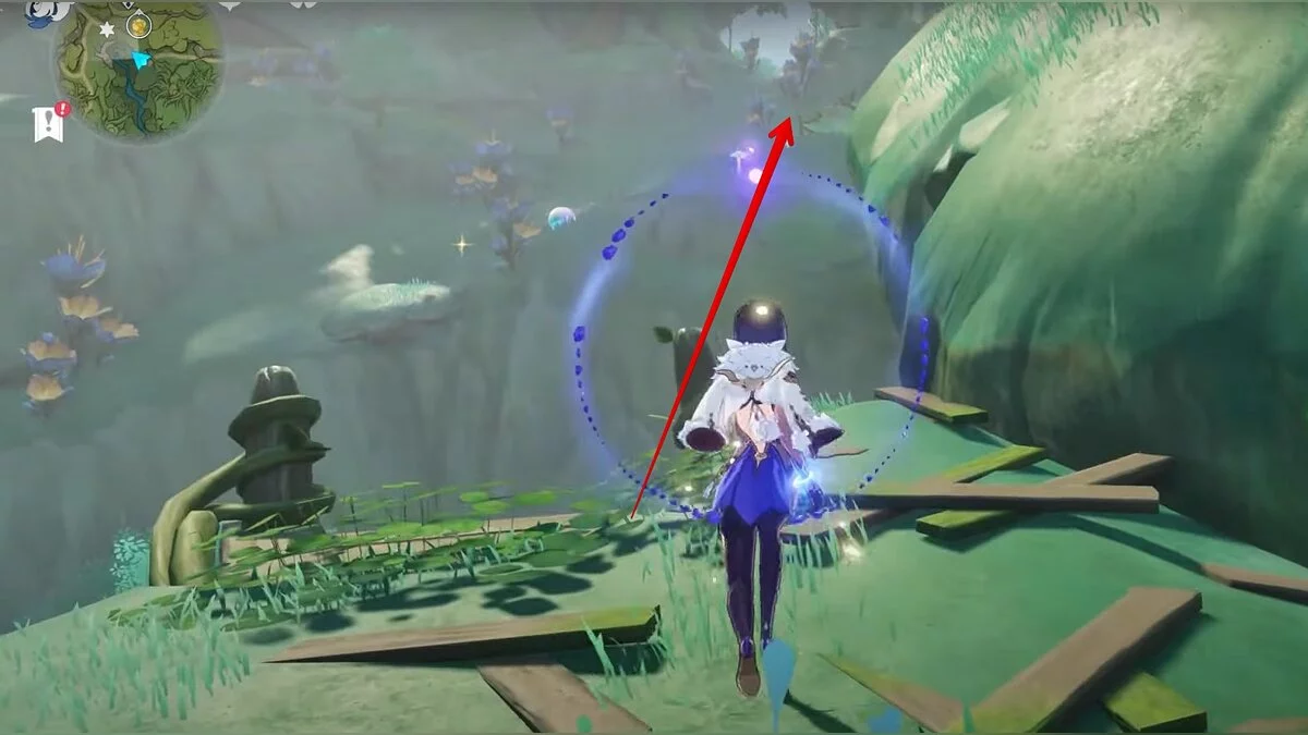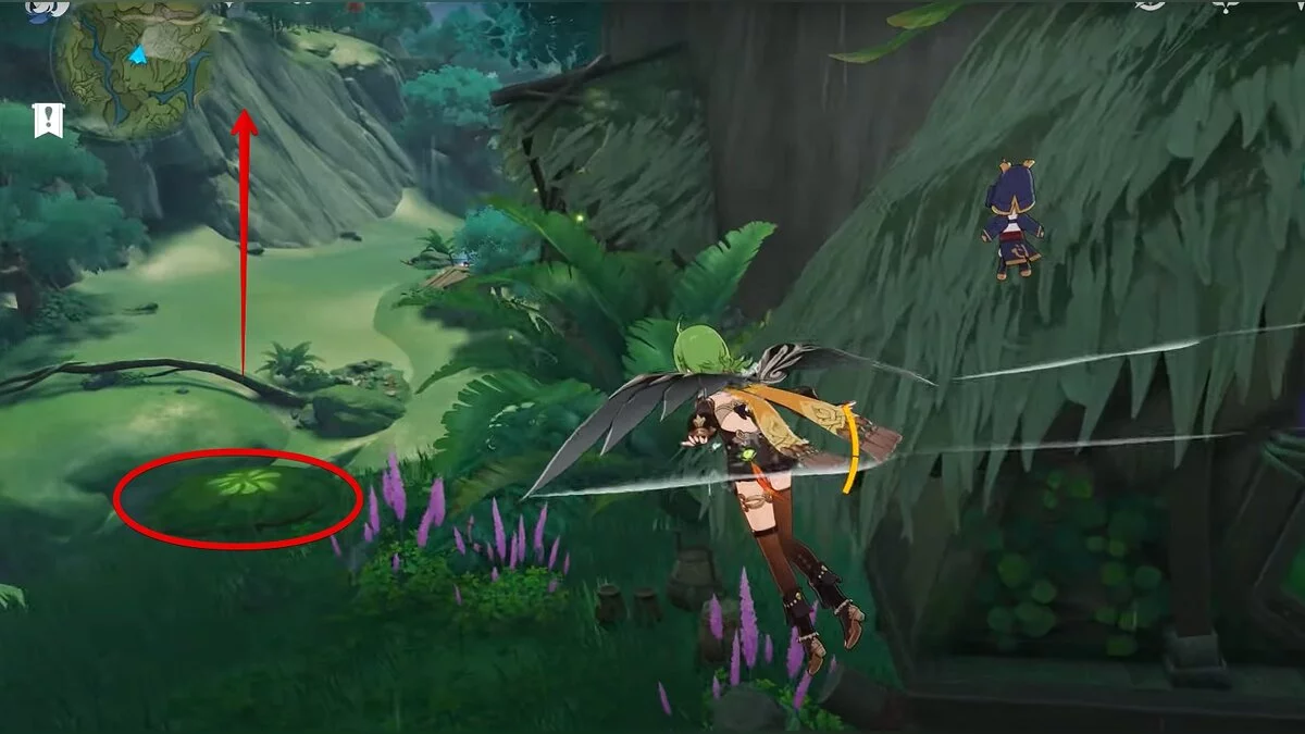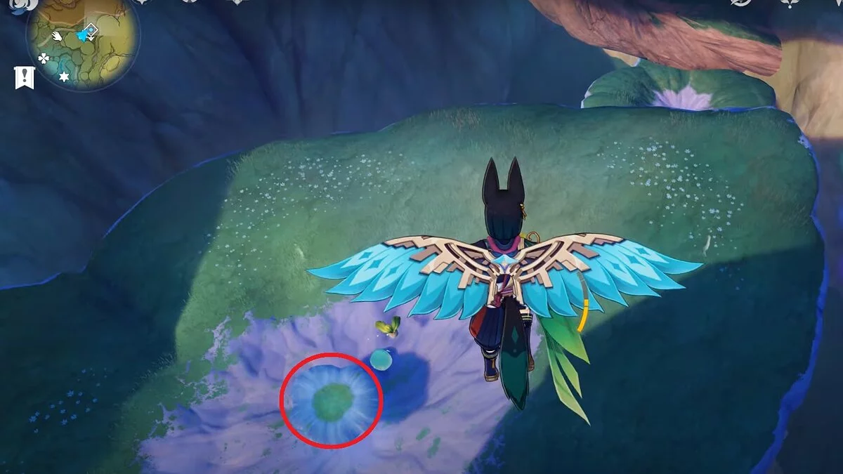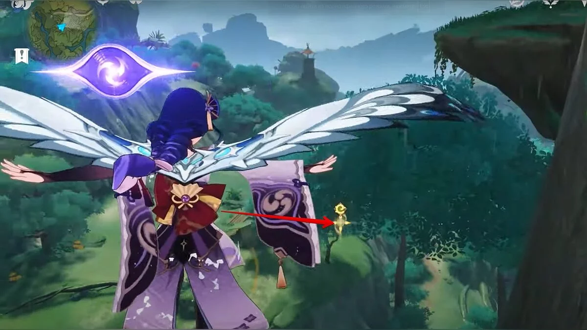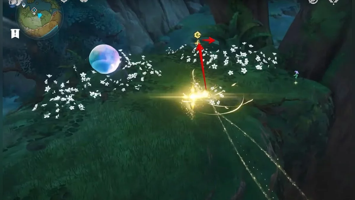 На потоке воздуха взлетайте вверх. Вам нужен цветок, расположенный северо-восточнее от вас. Там находится луковица, которую нужно активировать электро-атакой.