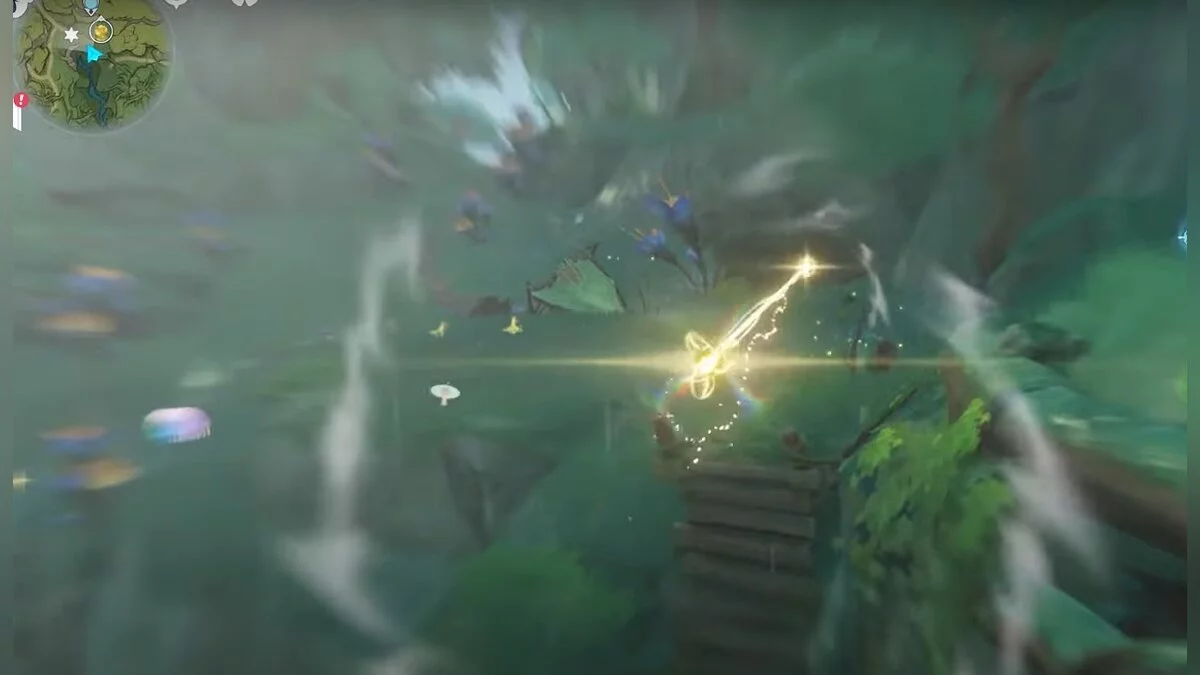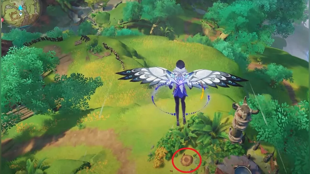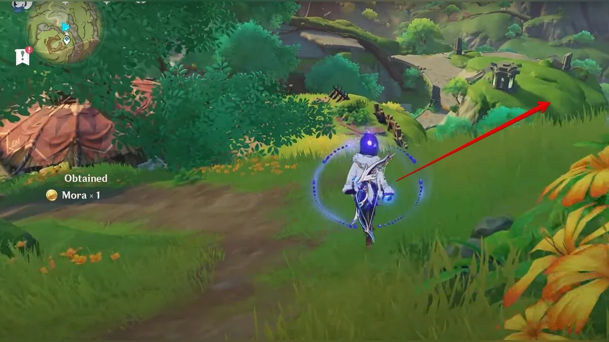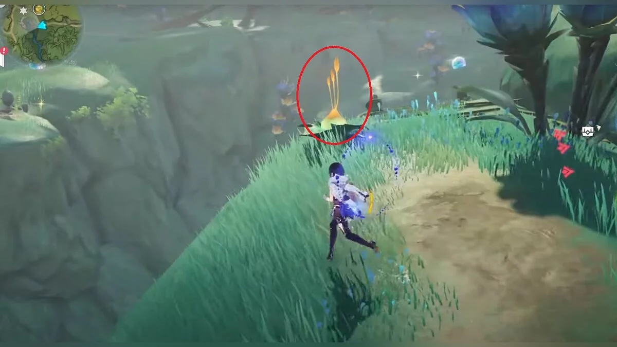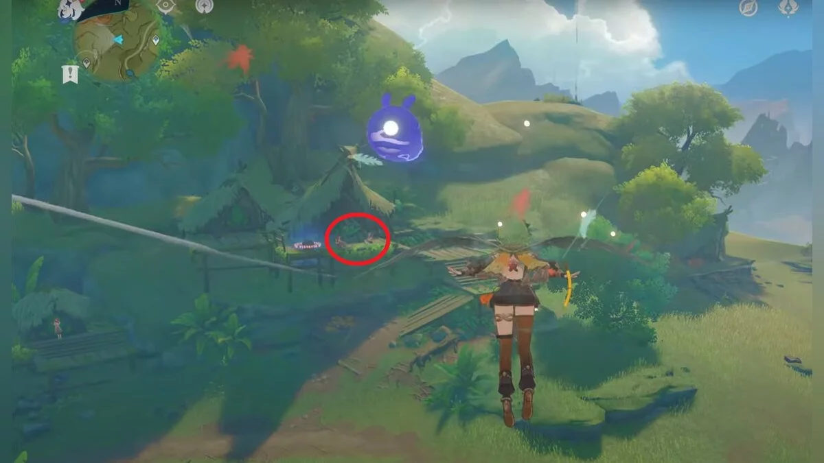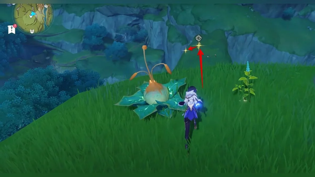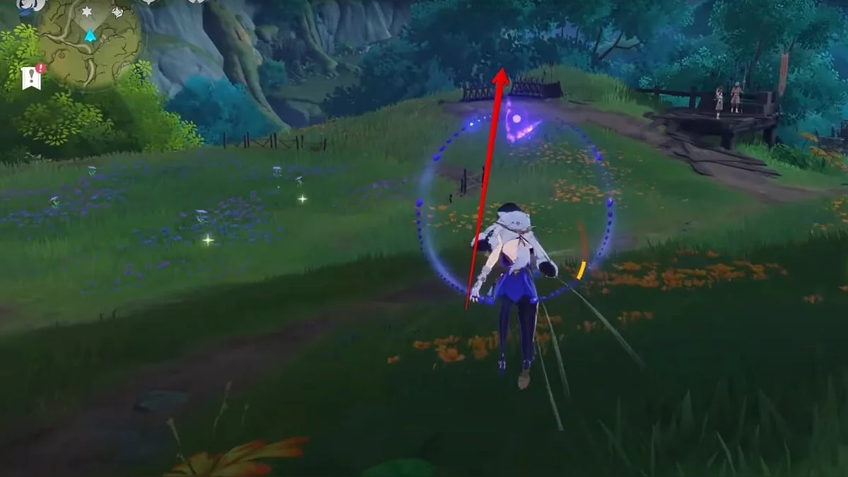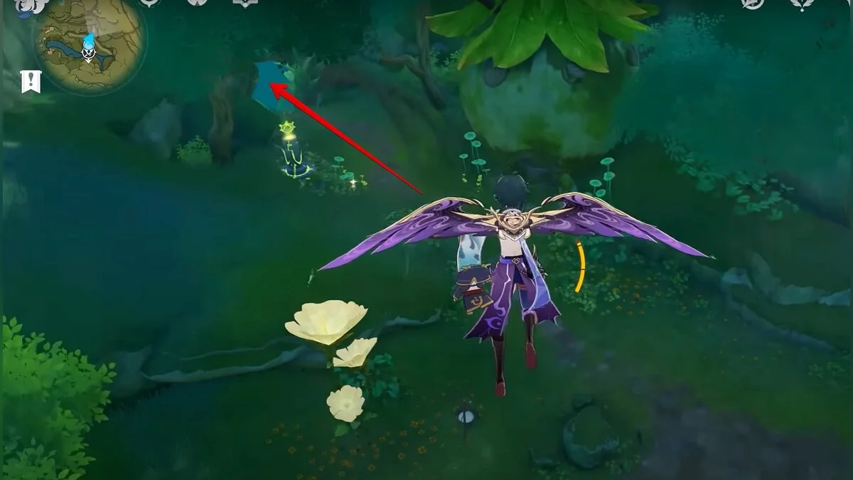 На потоке воздуха взлетайте вверх. Вам нужен цветок, расположенный северо-восточнее от вас. Там находится луковица, которую нужно активировать электро-атакой.