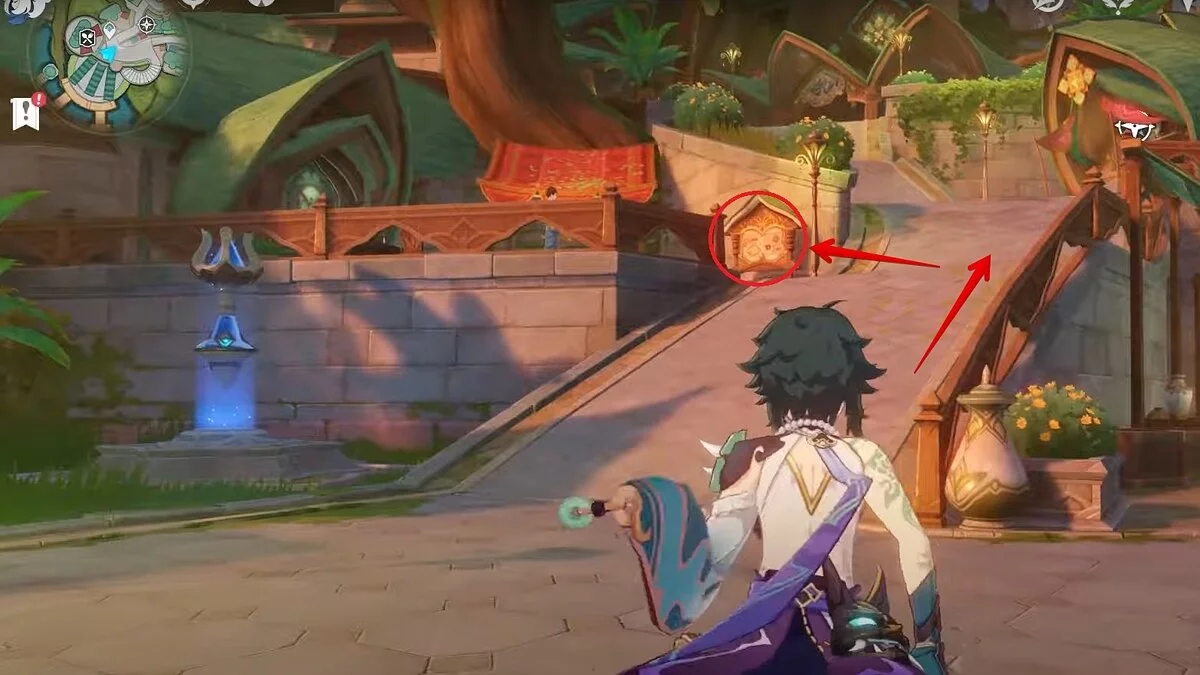 Около зелёных ворот поворачивайте налево и поднимайтесь наверх. Нужно будет карабкаться сначала по зданию, а затем по ветвям деревьев. На одной из них находится роскошный сундук.