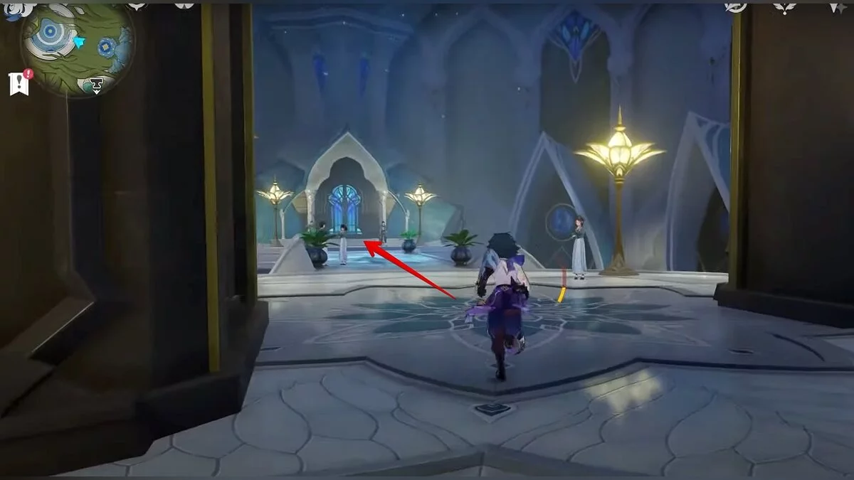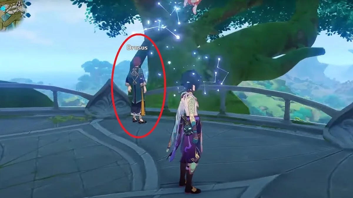 Вам нужно подождать до 12:00 следующего дня. Можете перевести стерлки часов в меню Паймон. Затем поднимайтесь наверх и заходите на территорию Храма Сурастаны. Поговорите с Друсусом.