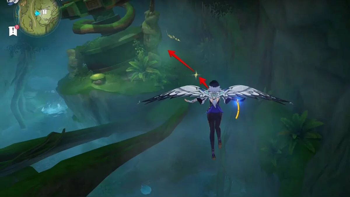 На месте камня появится растение — взаимодействуйте с ним. Убейте врагов, а затем по светящимся точкам летите на скалу с маяком. Там вы увидите роскошный сундук.