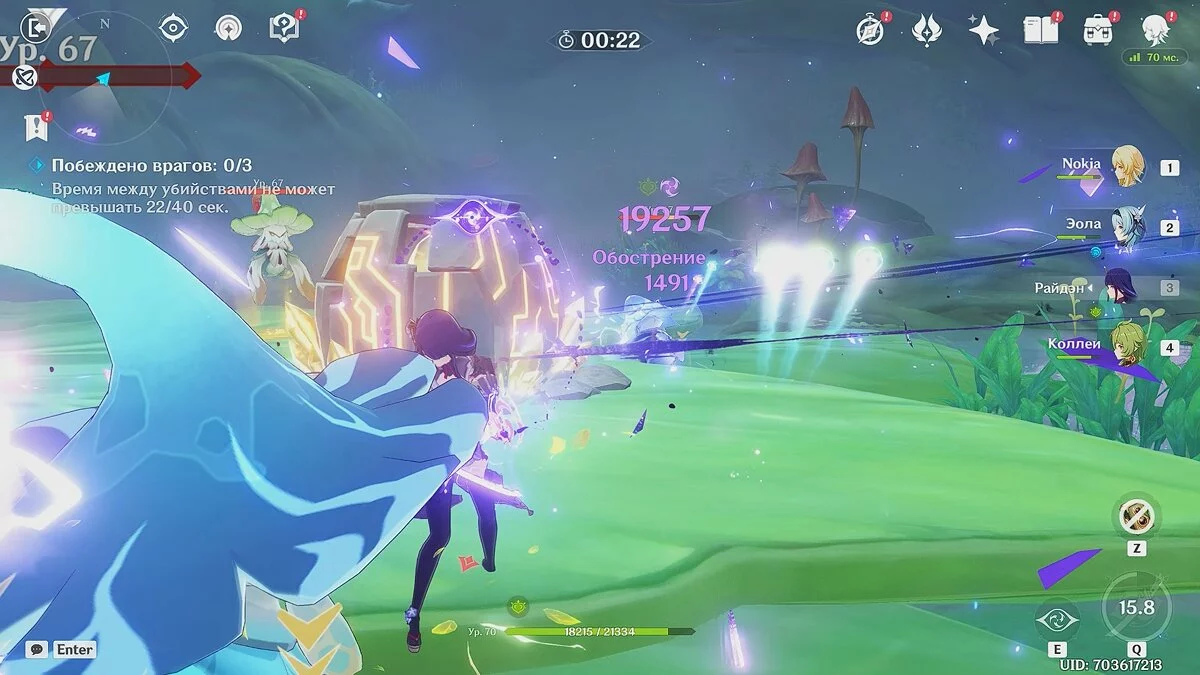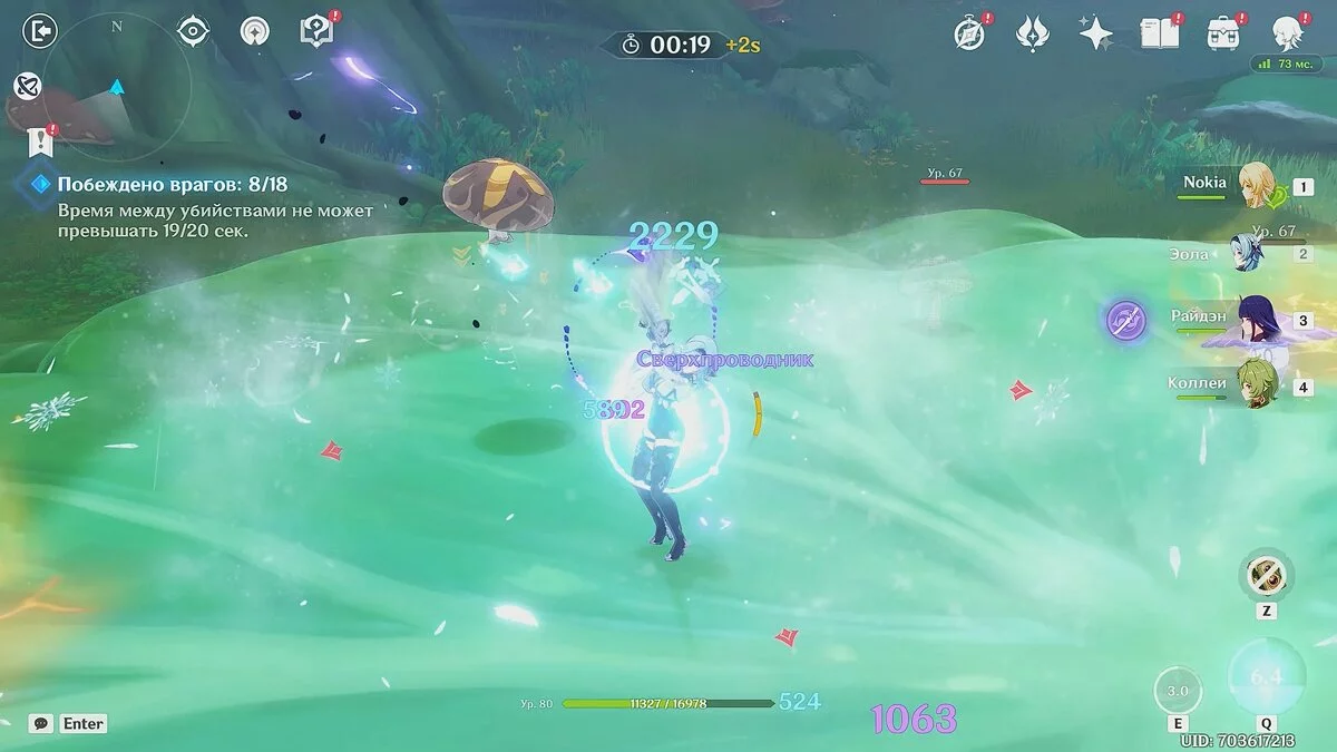 Это испытание предполагает, что вы должны расправиться с 18 врагами, но время между убийствами не может превышать 20 секунд. Атакуйте героями Дендро и Электро стихией, затем развивайте атаку Крио или Гидро персонажами.
