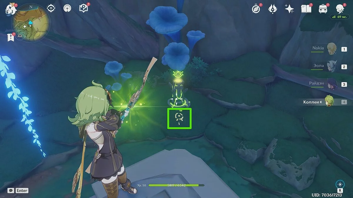 Как только разблокируете статую Дендро Архонта, бегите по тропе на юг. В тупике вы увидите несколько статуй, с которыми можно взаимодействовать при помощи стихии «Дендро».