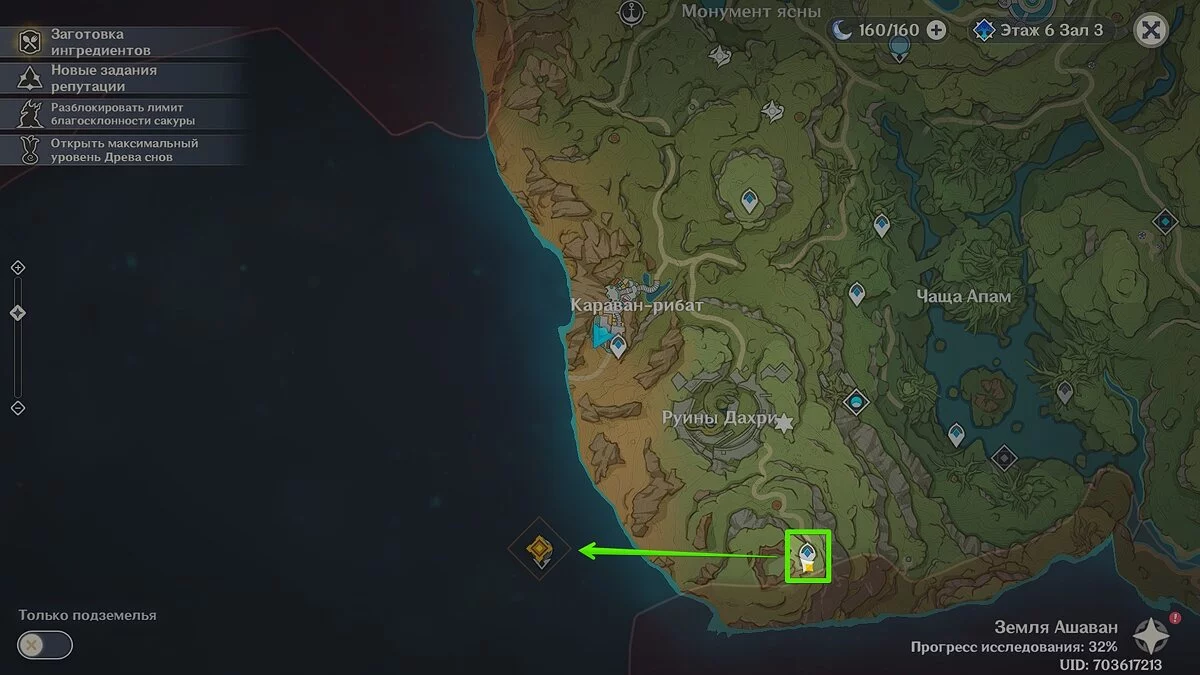 Теперь предстоит отправиться в поселение Караван-рибат и встретиться с Аль-Хайтамом. Когда сделаете это, задание обновится. Следуйте в ранее заблокированную область и взаимодействуйте со статуей Дендро Архонта. Проще всего добраться сюда, переместившись к телепорту, что за Руинами Дахри. Затем просто спланируйте вниз.