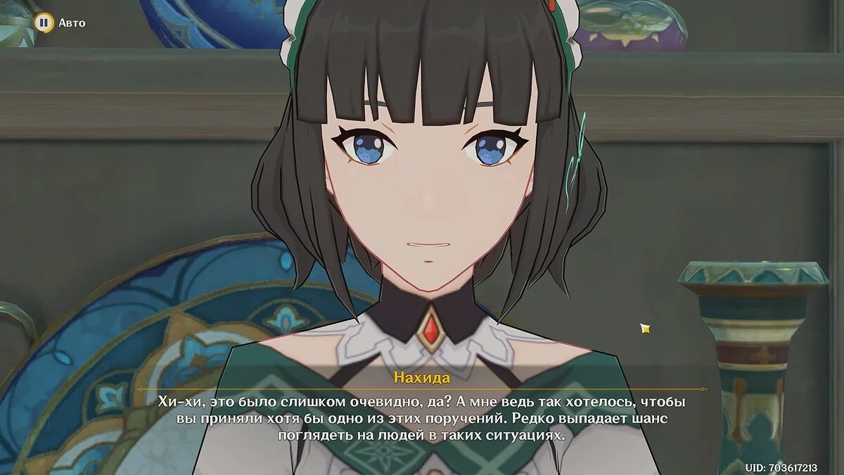 На входе вас будет ждать Нахида в облике Катерины. Войдите в оранжерею и побеседуйте с Хайпасией. После беседы с девушкой смотрите продолжительную кат-сцену.