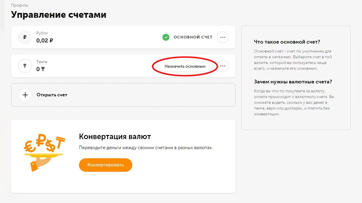 В меню профиля (правый верхний угол) нажмите на ваш номер телефона и выберите пункт «Открыть новый счёт». В качестве валюты выберите Тенге (Казахстан). Назначьте этот счёт основным.
