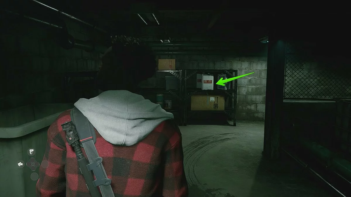 Перейдите в следующую комнату и поверните налево. У стены вы увидите полку с несколькими канистрами и коробками. Сделайте снимок.