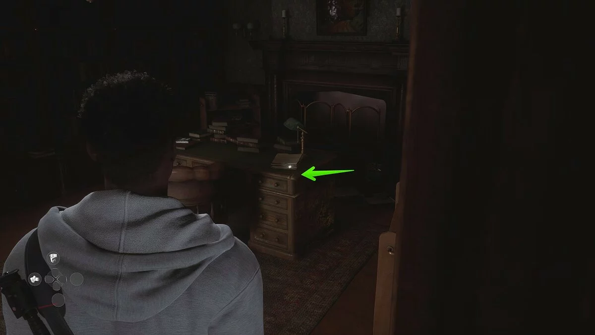 После кат-сцены и беседы с Кейт войдите в библиотеку и осмотрите стол в первой комнате напротив часов. В правой ближней части стола вы увидите большую царапину. Сфотографируйте её.