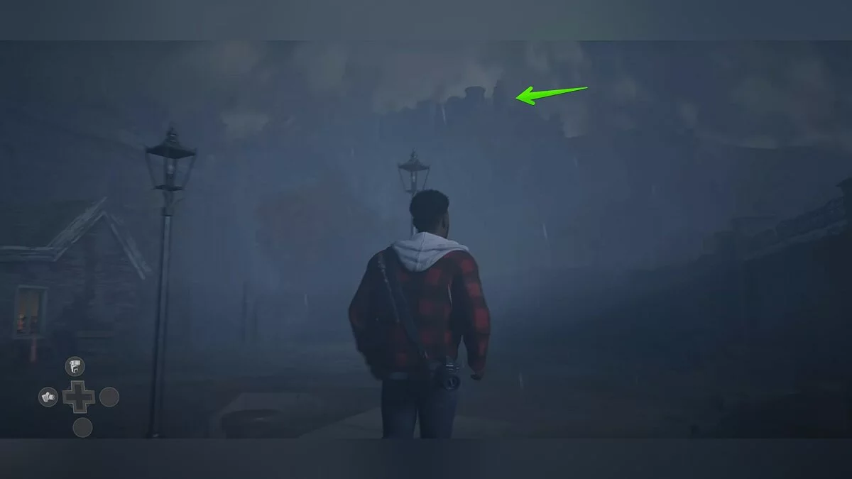 Не сходите с этого места и поверните камеру вправо и немного наверх. На холме стоит отель, из которого герои сумели сбежать. Сфотографируйте его.