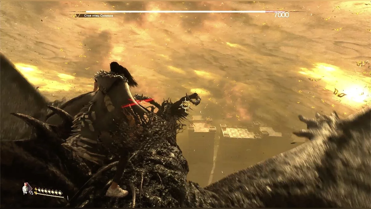 Чтобы успешно их уничтожить, используйте захват цели. К сожалению, игра плохо удерживает прицел, поэтому фиксатор нужно постоянно возвращать назад на крылья. Как только одно крыло загорится — рыцарь не сможет взлетать, однако его атаки станут опаснее. Воин ускоряется, оставляя за собой огненный след, придется увернуться несколько раз, чтобы не попасть под такой опасный рывок.