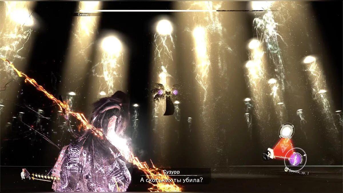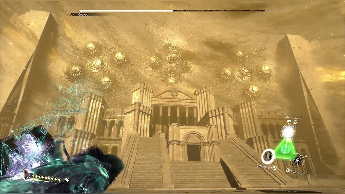 Когда отнимете ¼ жизней, Сузурр взлетит, а огонь перестанет помогать. В эти моменты будьте особенно внимательны — все его атаки по площади, увернуться очень сложно. Приемов несколько — золотая птица, множество огненных шаров или молнии на полу. Не забывайте использовать телепорт — он все еще работает. Лучше вообще не атаковать демона, пока он в воздухе и сосредоточиться на уклонении. Босс в итоге все равно приземлится, а вы сохраните много жизней.