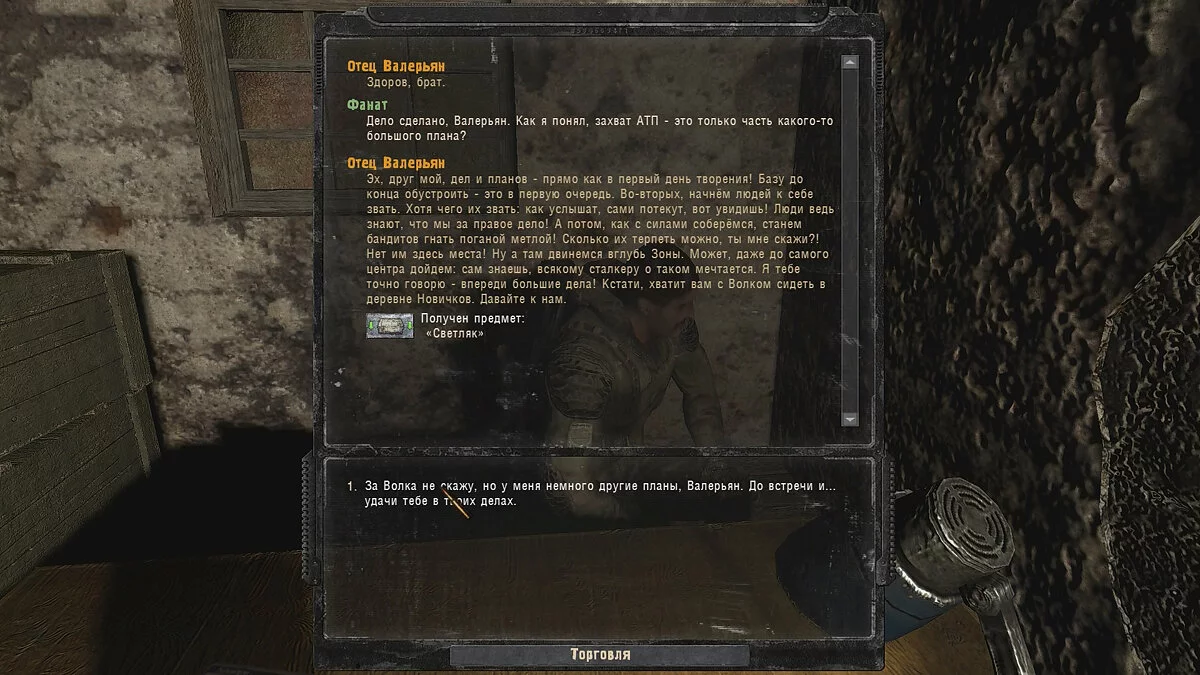 Отыскав сталкеров, вам необходимо зачистить АТП. Убейте врагов и возвращайтесь к Валериану. Он отдаст артефакт «Светляк».