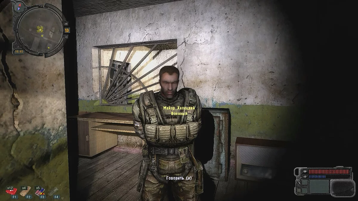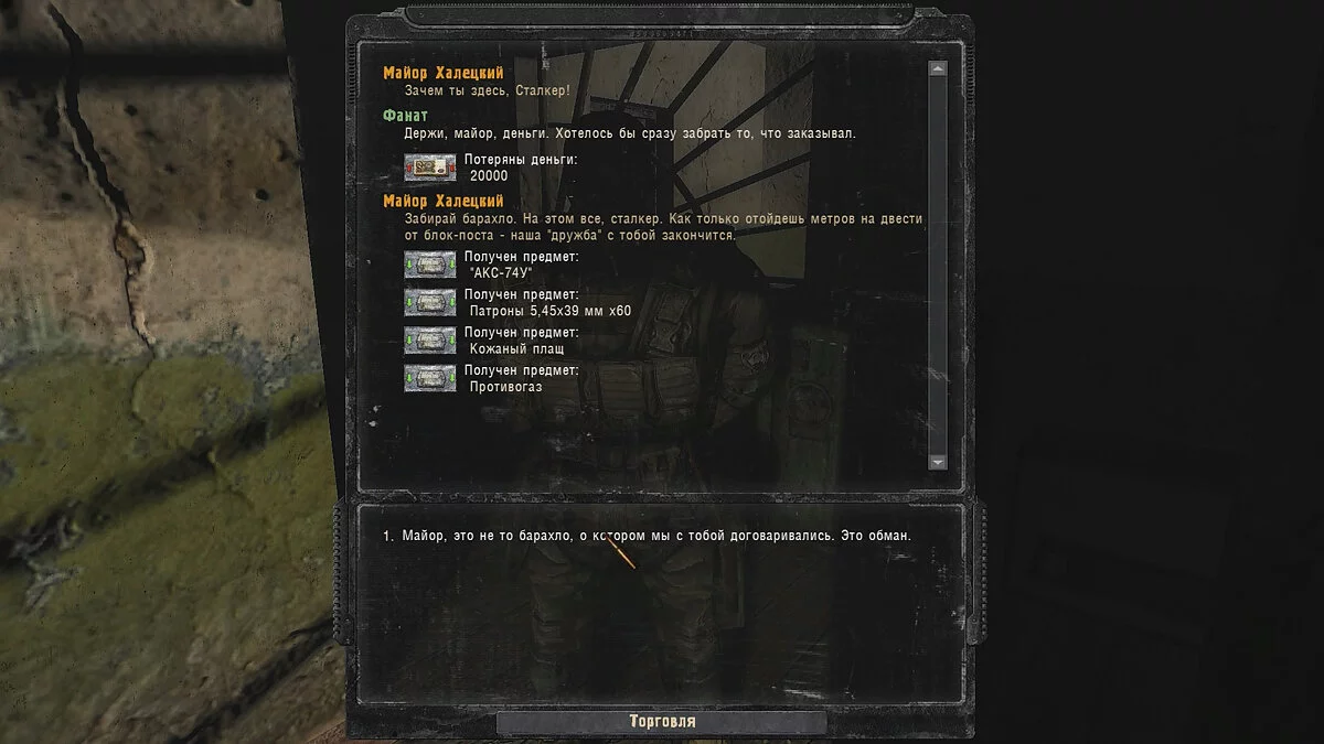 Следуйте к майору Халецкому на блокпост военных, отдайте ему кейс и 20 000 рублей. Взамен он даст вам АКС-74У, патроны, кожаный плащ и противогаз. Наверняка вы поняли, что это не те вещи, которые майор должен был отдать.