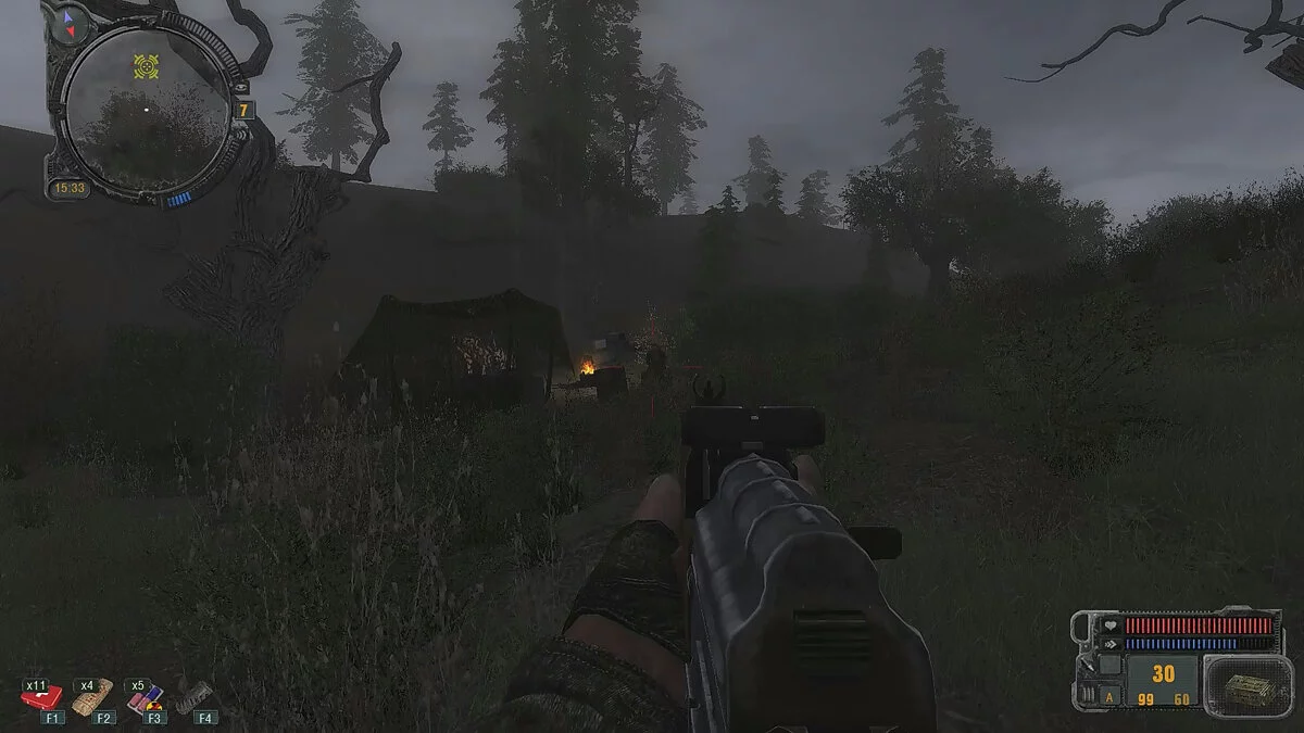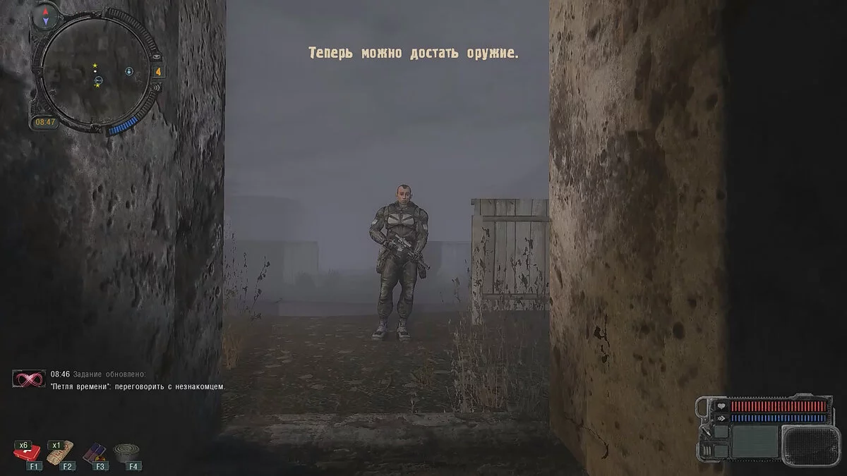 Рассказав торговцу о том, что с вами произошло, отправляйтесь на базу сталкеров и найдите там бойца по кличке Шпала. Он застрял в будущем так же, как и вы, но даст подсказку, как можно вернутся в свое время. Необходимо проследовать к блокпосту военных, что чуть дальше деревни новичков. Однако не торопитесь, так как военные убьют героя очень быстро, если вы приблизитесь на минимальное расстояние. Ваша задача — найти справа от поста большую бетонную трубу и забежать прямо в неё, используя аптечки.