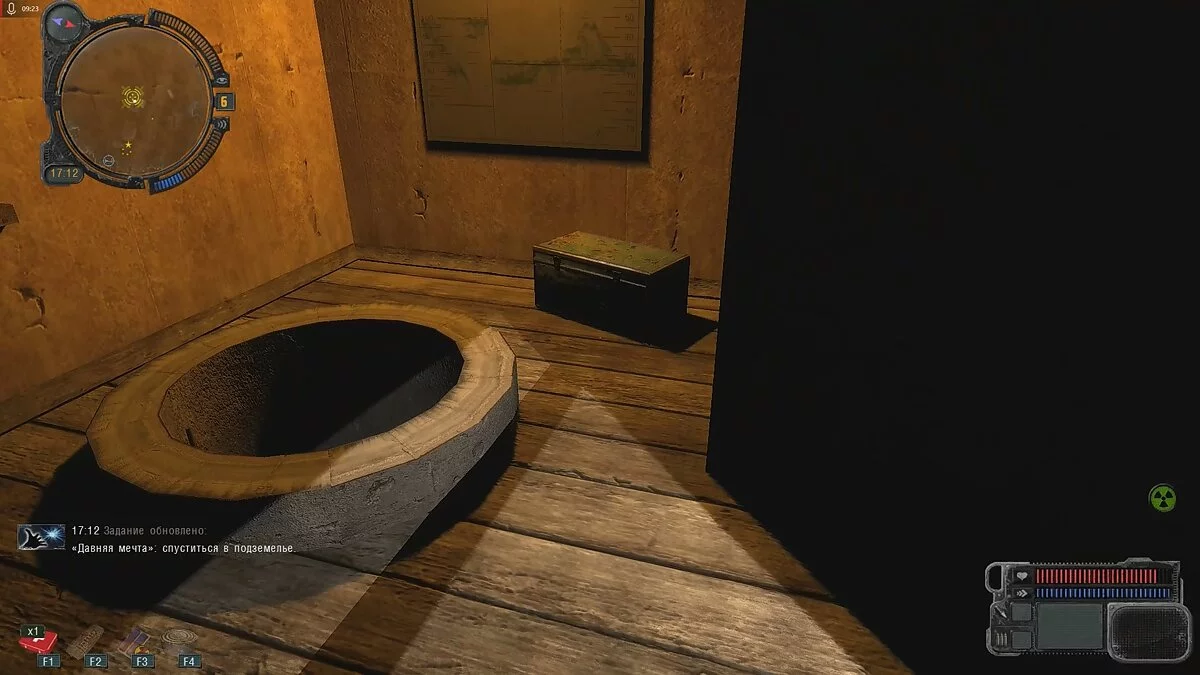 Когда вы завершите квест «Посылка», следуйте по маркеру в деревню новичков и побеседуйте со сталкером по кличке Волк. Вы получите ключ для первого здания справа (от центрального входа в деревню). Отоприте дверь и прыгайте в большой люк.