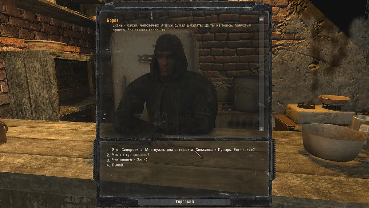 Здесь появится выбор: вы можете заплатить сразу 40 000 рублей, и тогда не нужно будет выполнять побочное задание, чтобы получить артефакты. Однако если у вас нет необходимой суммы, Боров даст вам дополнительное задание: нужно найти автомат, который украл кто-то из его корешей. Выполнив квест, стоимость снаряжения снизится до 5 000 рублей.