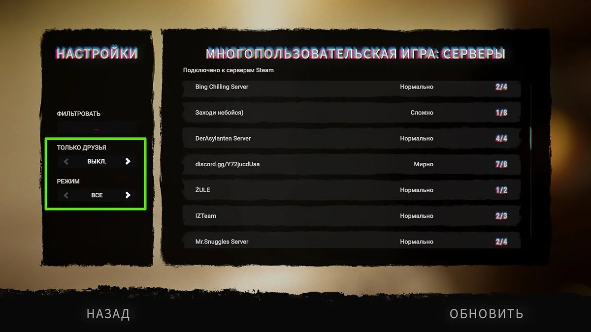По умолчанию в столбце справа вы увидите все общедоступные сервера пользователей Steam. Слева можно отсортировать их по режиму сложности. Если вы включите режим «Только друзья», то увидите сервера друзей из Steam.