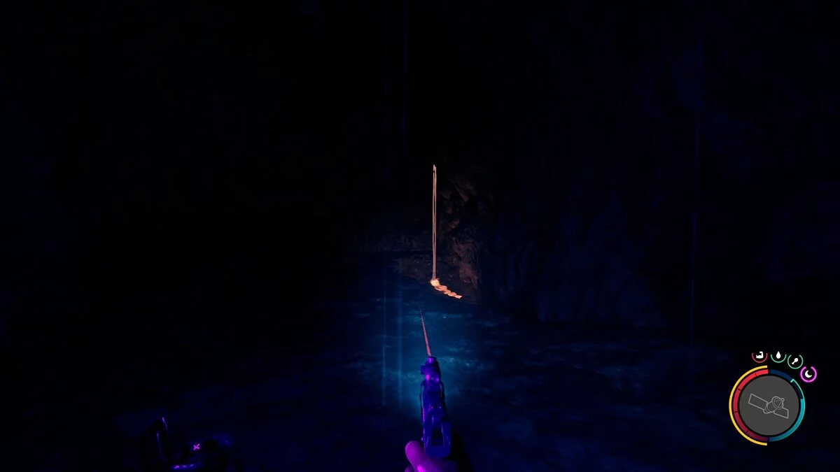Отправляйтесь на маркер «Маячок 2» и осмотрите скалу. На вершине вы увидите труп, который связан верёвкой. Разрубите трос, чтобы тело свалилось вниз. Вместе с ним упадёт и фонарик. Стоит отметить, что фонарь может находиться не прямо на теле, поэтому рекомендуем осмотреть область в нескольких метрах от него.
