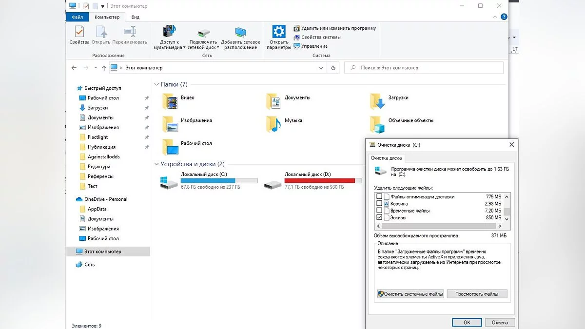 Удалите лишние файлы и папки вручную или воспользуйтесь встроенным приложением. В поле поиска на панели задач введите «Очистка диска» без кавычек и выберите соответствующий пункт. Либо можете прибегнуть к помощи стороннего ПО, например, CCleaner.
