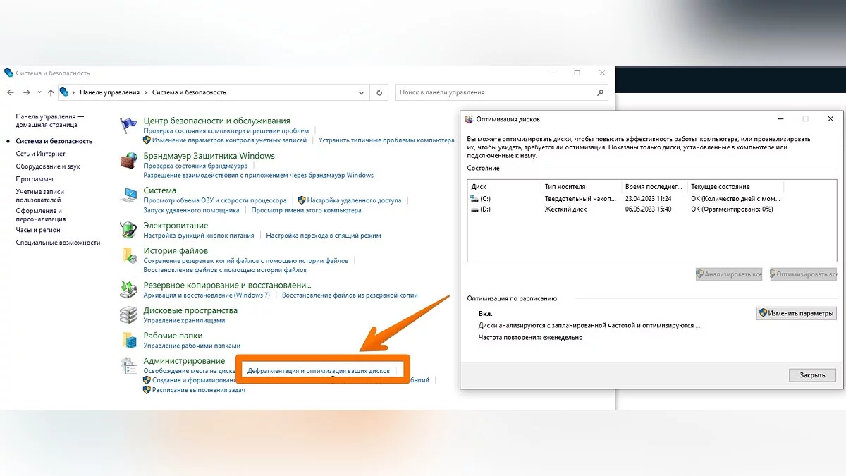 Если говорить простым языком, то дефрагментация — это упорядочивание данных для ускорения чтения и записи файлов. Откройте панель управления (можно в поле поиска на панели задач либо в меню «Пуск») и, выбрав раздел «Система и безопасность», кликните на пункт «Дефрагментация и оптимизация ваших дисков». В новом окне вы можете настроить расписание для автоматической оптимизации или в ручном режиме запустить процесс.