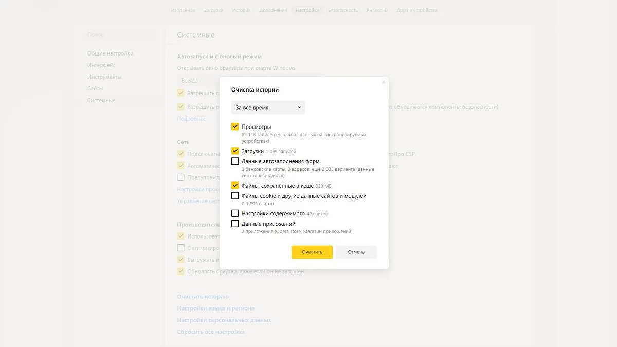 Щёлкните на фразу «Очистка истории» и, выбрав всё необходимое, подтвердите своё решение, нажав «Очистить».
