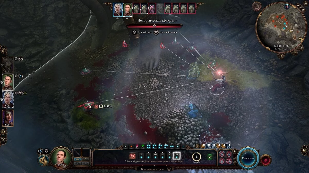 Справа вы увидите стаю крыс в яме — спрыгивайте туда и приготовьтесь к бою. Стоит предупредить, что грызуны будут появляться каждый новый ход, поэтому лучше уничтожать их как можно быстрее. Благо, у крыс всего по 2 единицы здоровья. Можете использовать прокачанную волшебную стрелу — по одному выстрелу на каждого монстра.