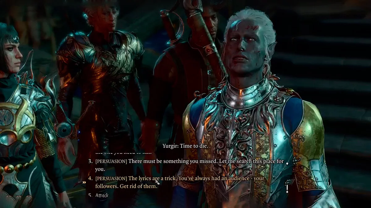 В Baldur's Gate 3 существует различное множество вариантов прохождения квестов, поэтому вы вправе обмануть Юргира и заставить его убить себя. Для этого нужно обязательно пройти автоматическую проверку на Проницательность, затем при первой встрече не предлагать заняться поиском пропавшего юстициара, а выбрать вариант «[Убеждение] В словах песни скрытая хитрая уловка. У тебя всегда были слушатели — твои слуги. Избавься от них».