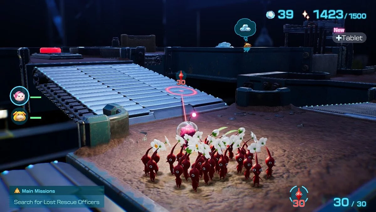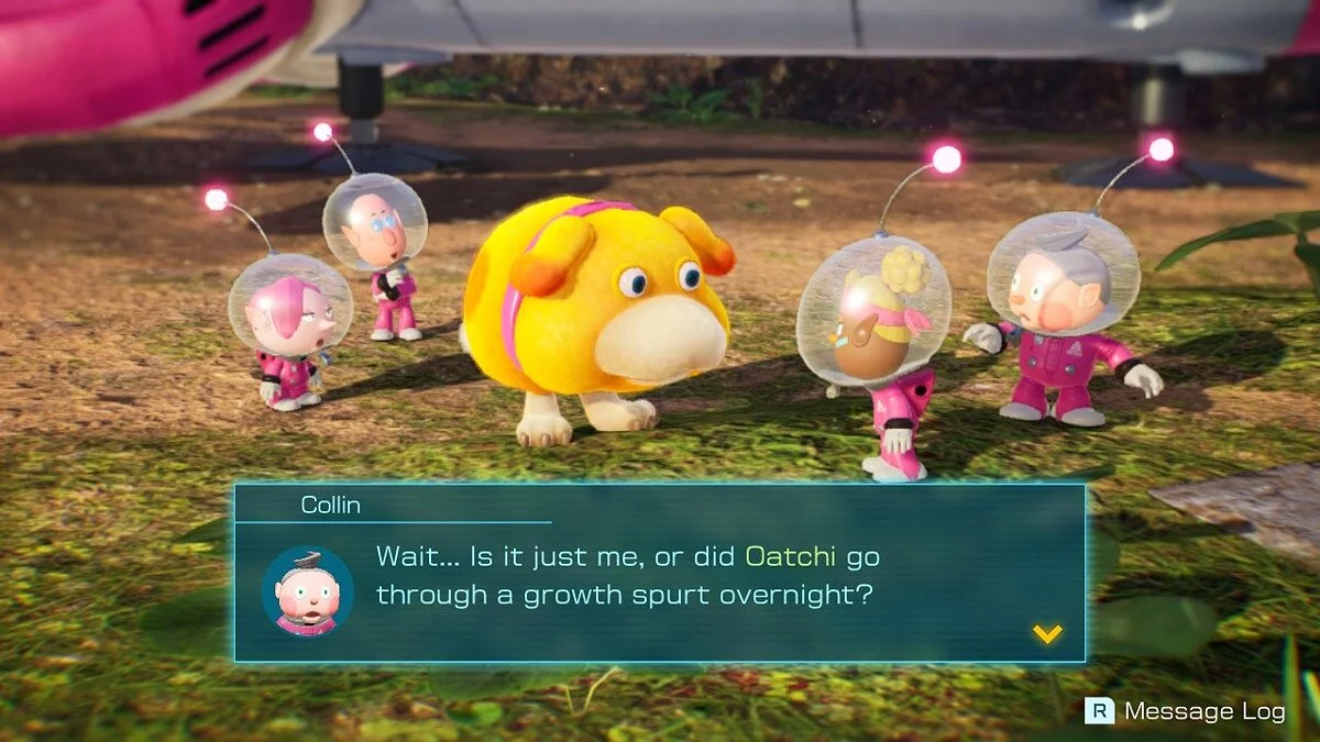 Как и Олимар, наш герой знакомится с пикминами и начинает ими командовать. Помимо разноцветных малышей, нам помогает двуногий пес Оатчи, который является чуть ли не самым главным нововведением четвертой части. Лохматый соратник не только меняет устоявшийся геймплей серии Pikmin, но и активно толкает сюжетную линию.