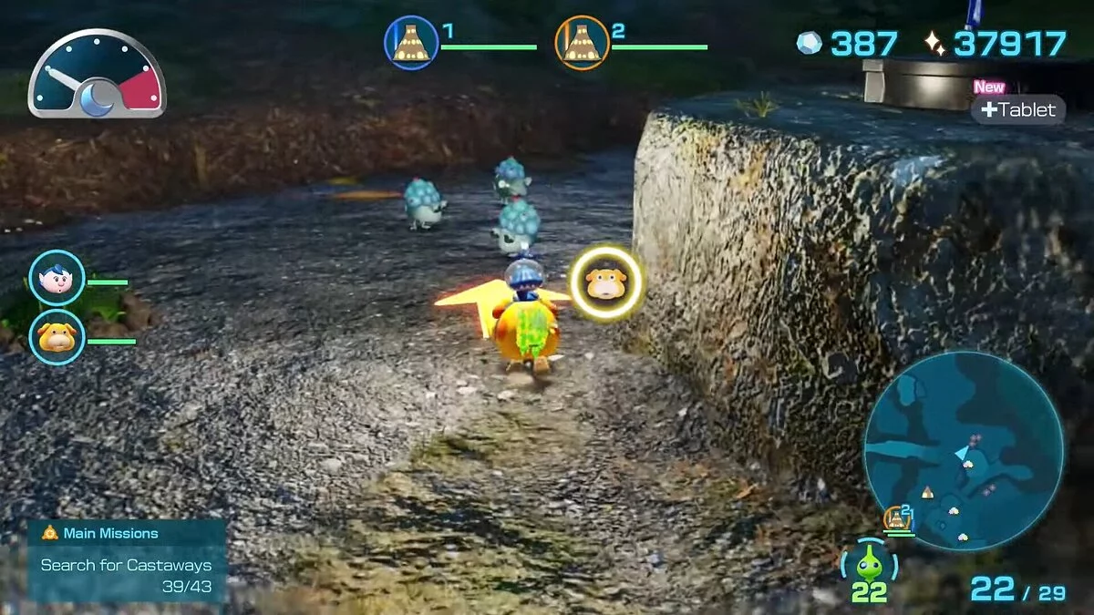 Другим важным нововведением стал вышеупомянутый пес Оатчи. Лохматый может переносить армию пикминов на своей спине, таранить объекты и сбивать лежащие на краю уступа предметы. Наш герой может оседлать пса, что поможет не только быстрее перемещаться по уровню, но и допрыгнуть до недоступных ранее высот. За спасение членов экипажа или случайных искателей сокровищ вы получаете очки способностей, которые тратятся на улучшение возможностей собаки. Со временем Оатчи научится выше прыгать, таскать тяжелые предметы и быстрее откапывать предметы из земли.
