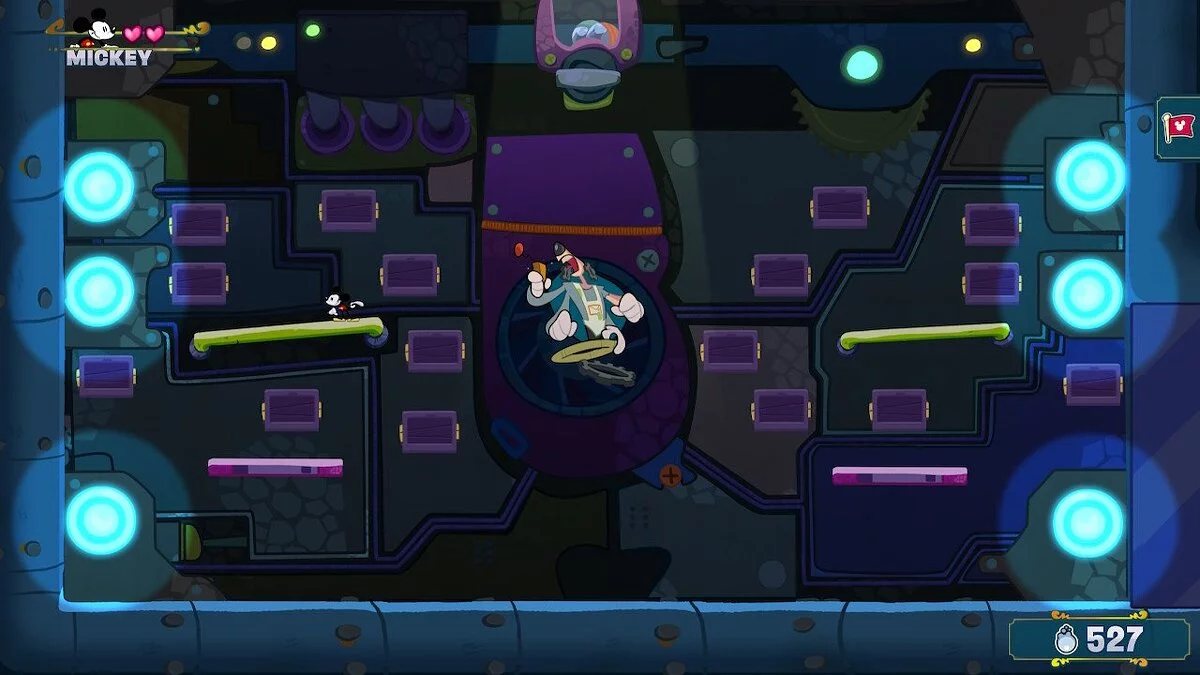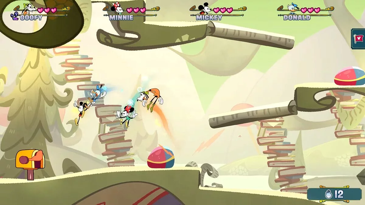 В начале игры вы можете выбрать одного из четырех персонажей. Набор способностей у героев одинаковый, разница в визуальном воплощении. Для выполнения двойного прыжка Микки использует ракетный ранец, Минни — бумажный самолётик, холерик Дональд пользуется петардами, а одержимому едой Гуфи помогает острый перец.
