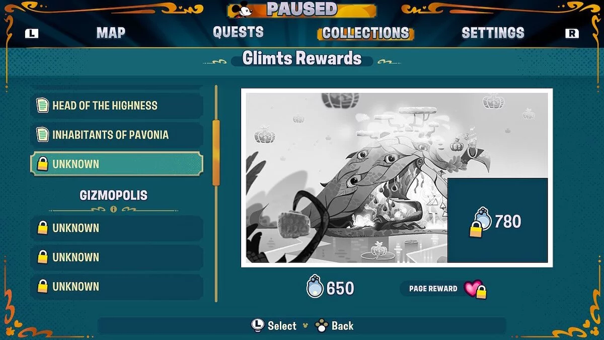 Несмотря на скудное оформление, локации в Illusion Island интересно изучать. Игра переполнена тайниками и секретами. Увидели подозрительную стену? Почему бы не прыгнуть в ее сторону! Награды за старания понравятся фанатам Микки Мауса — коллекционные карточки, сувениры, пазлы и памятные вещи. Все перечисленное можно посмотреть и покрутить в специальном меню.