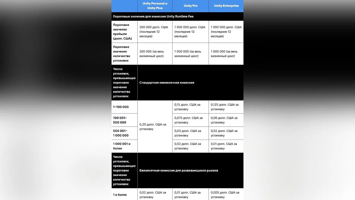 Владельцы движка с 1 января 2024 года вводят новую комиссию — Unity Runtime Fee. Она будет взиматься в том случае, если количество установок игры, созданной на Unity, превысит определенный порог. Условий для появления комиссии пара: