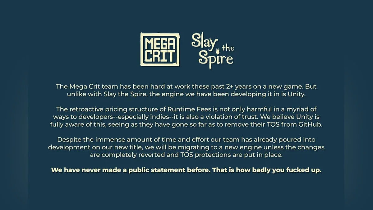 В похожей ситуации оказались и авторы Slay The Spire. Они уже два года работают над новым проектом на Unity и будут вынуждены перенести игру, если ситуация не изменится. По их словам, решение компании не только наносит вред всем разработчикам и, в особенности, инди-сектору, но и подрывает доверие между создателями игр и компанией.