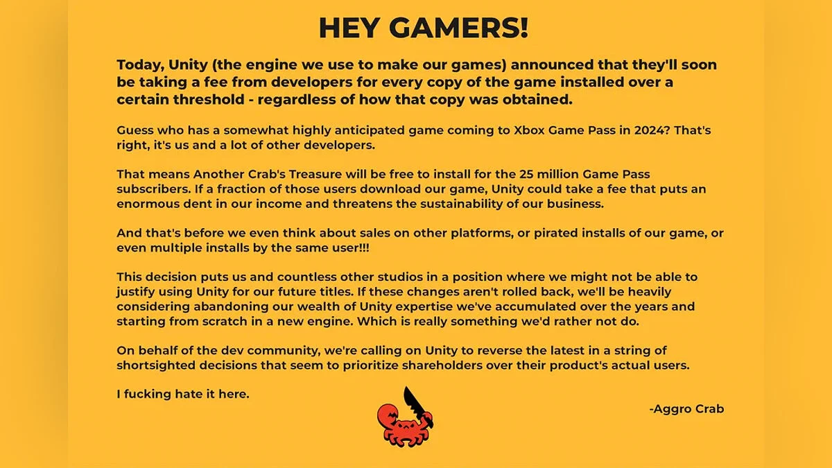 Во-первых, владельцы Unity не подумали о том, что будет с игрой в Game Pass. Игры из этого сервиса могут скачать и установить больше 25 миллионов игроков. При этом, зачастую, разработчики получают за размещение игры в сервисе Microsoft фиксированную плату, а значит каждое скачивание приведет к уменьшению дохода. Студия Aggro Crab подняла этот вопрос и заявила, что если условия комиссии не изменятся, они будут вынуждены искать замену Unity.