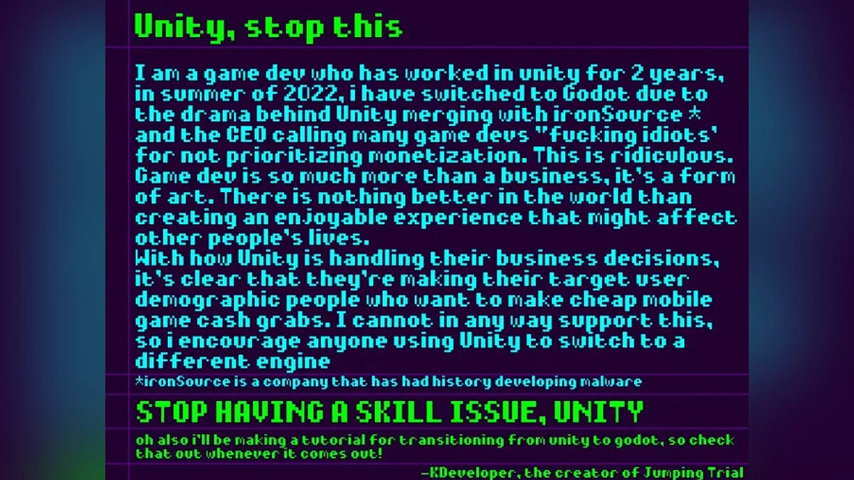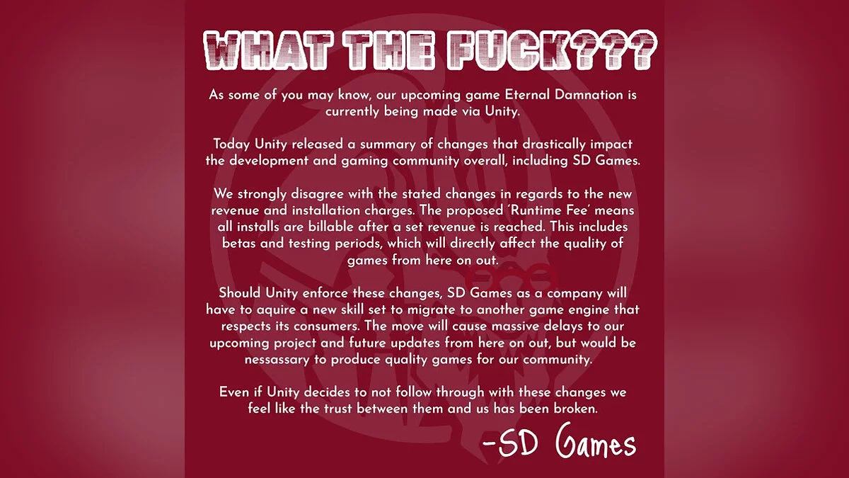 12 сентября Unity, компания-создатель одноименного игрового движка, объявила об изменении в бизнес-модели. Боссы решили брать комиссию не в процентах от выручки, а с каждой установки. Разработчики на Unity, увидев новые условия, впали в настоящую панику и спешно начали либо искать альтернативу движку, либо посылать сигналы SOS игровому сообществу. Рассказываем, к каким последствиям могут привести эти «нововведения» и как компания отреагировала на разгорающийся скандал.