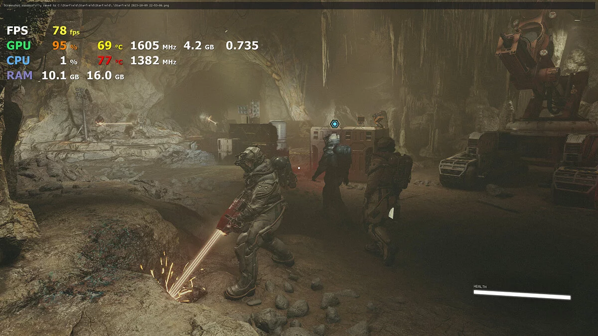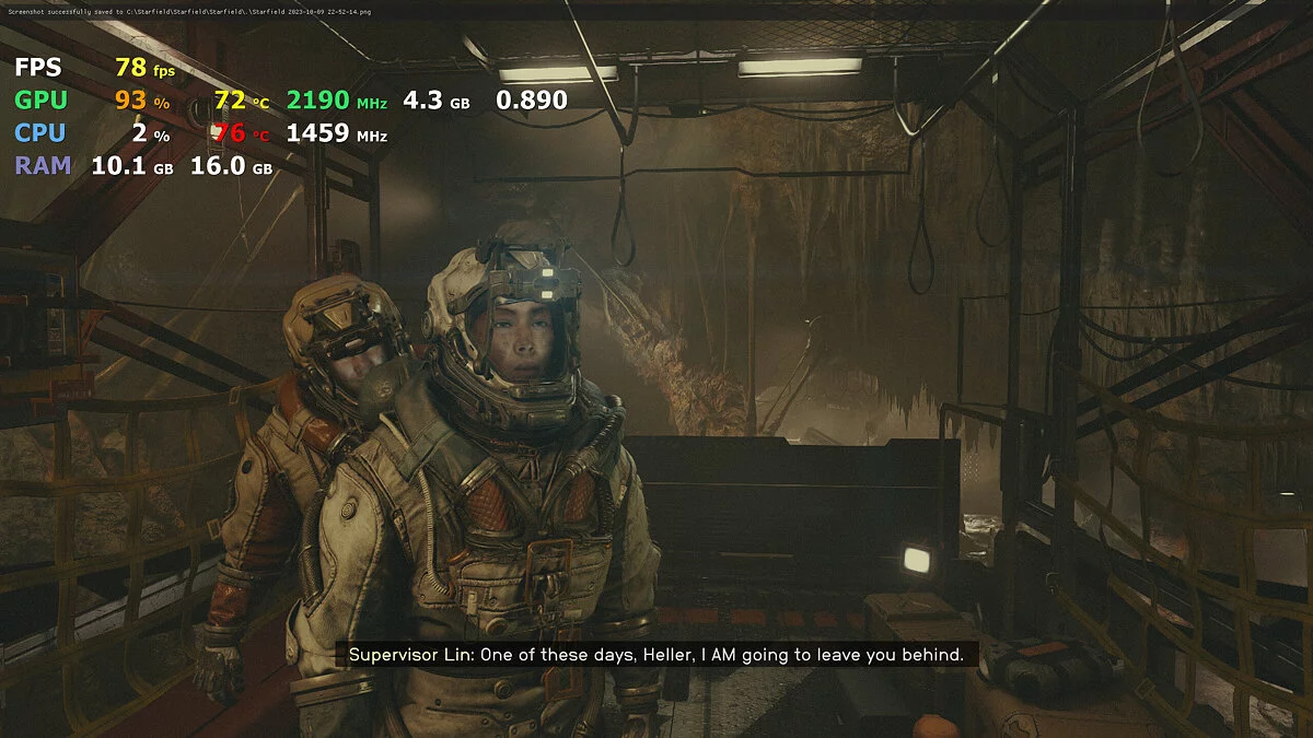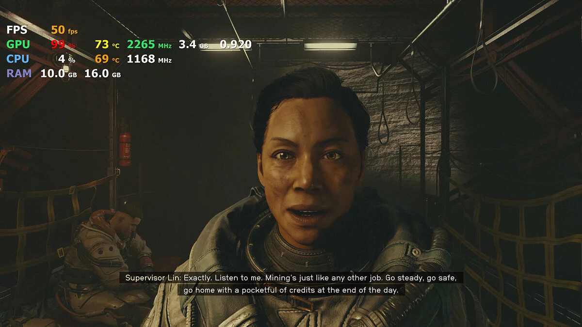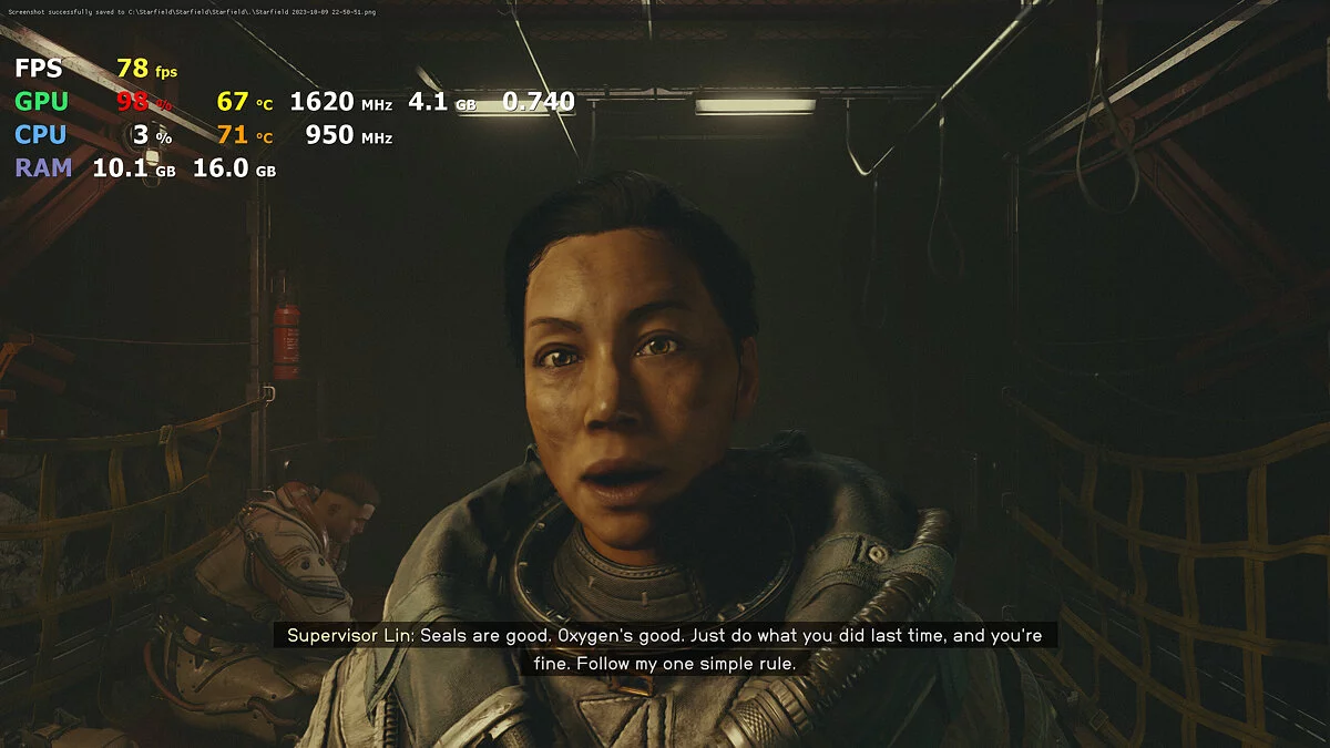 Starfield. Сначала мы провели тесты в нативном разрешении 2560x1440 на максимальных настройках без масштабирования и получили в среднем около 50 кадров в секунду.