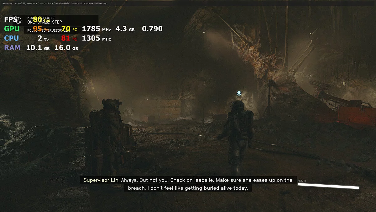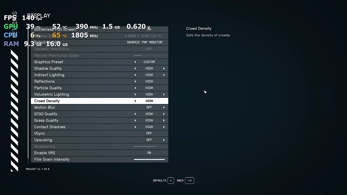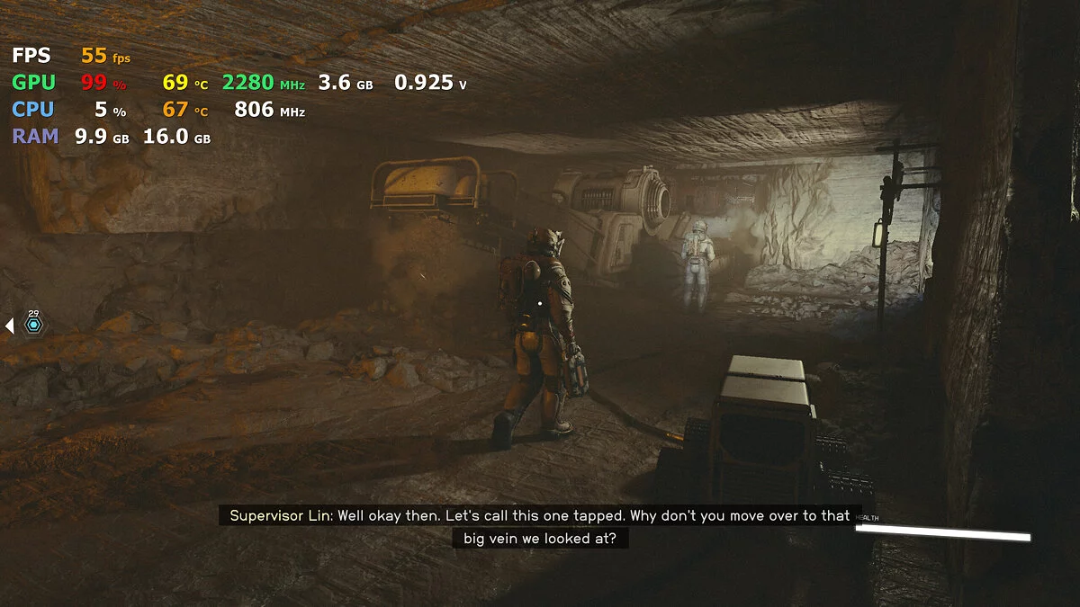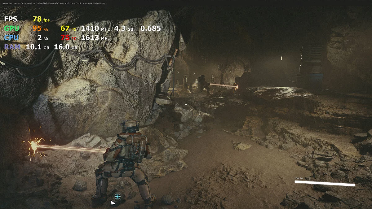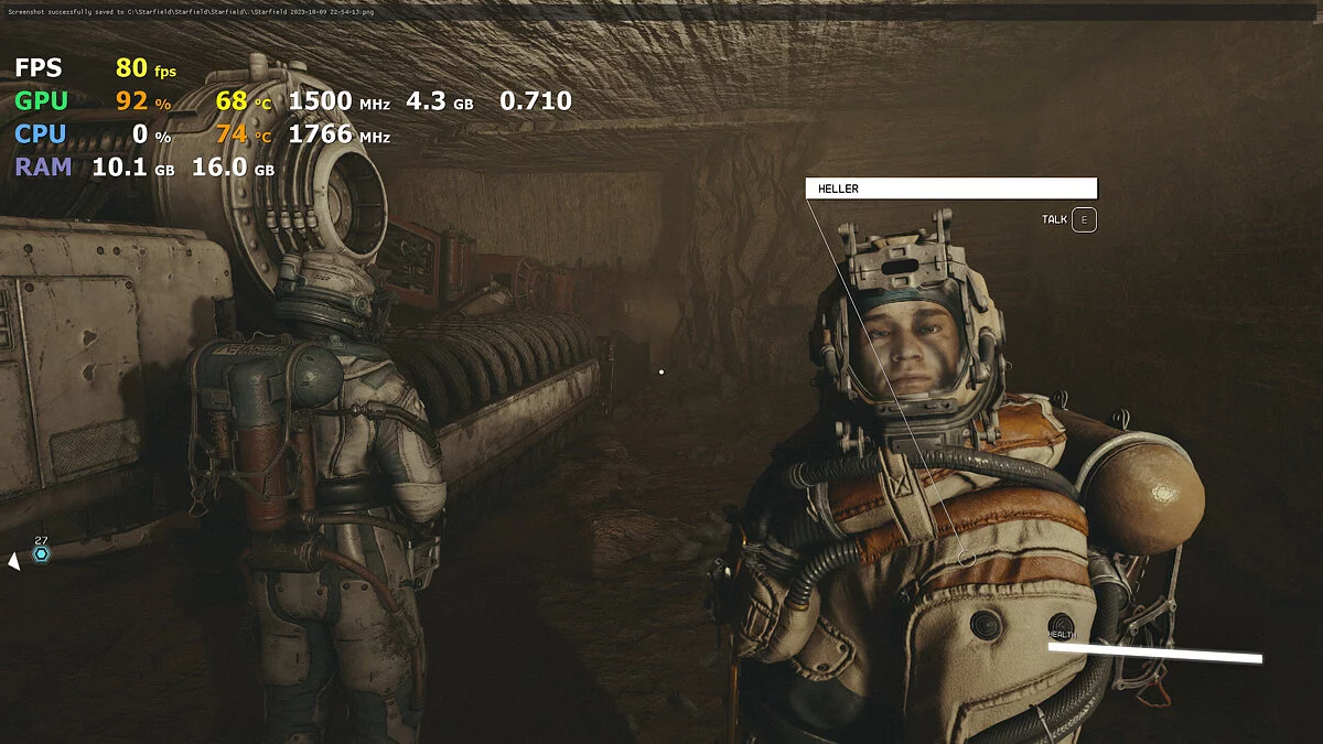 Starfield. Сначала мы провели тесты в нативном разрешении 2560x1440 на максимальных настройках без масштабирования и получили в среднем около 50 кадров в секунду.