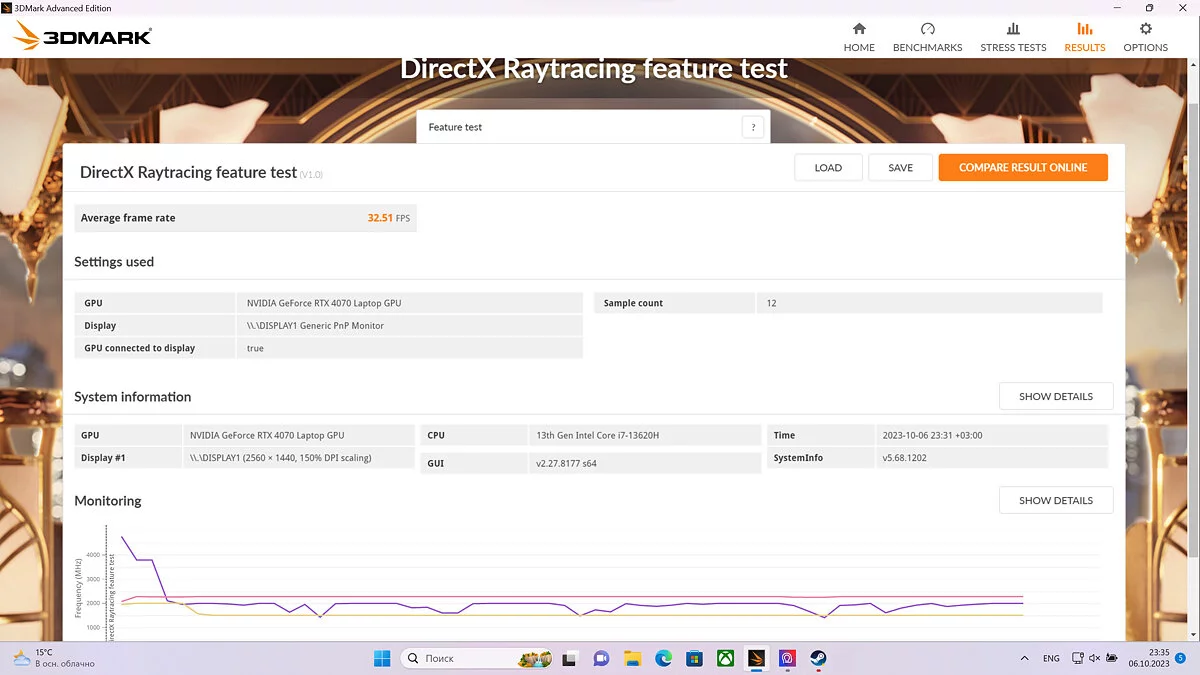 Режим рейтрейсинга перегрузка (с трассировкой путей) — 40-45 кадров в секунду. Бенчмарк в этом случае врёт и показывает средние 70 FPS.