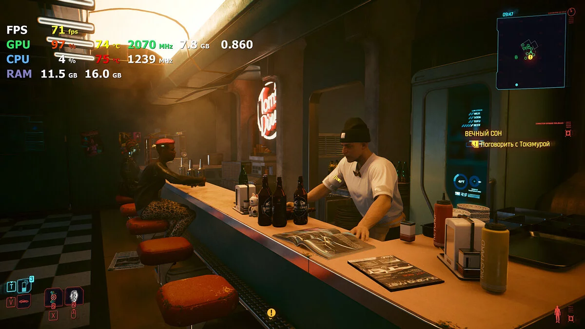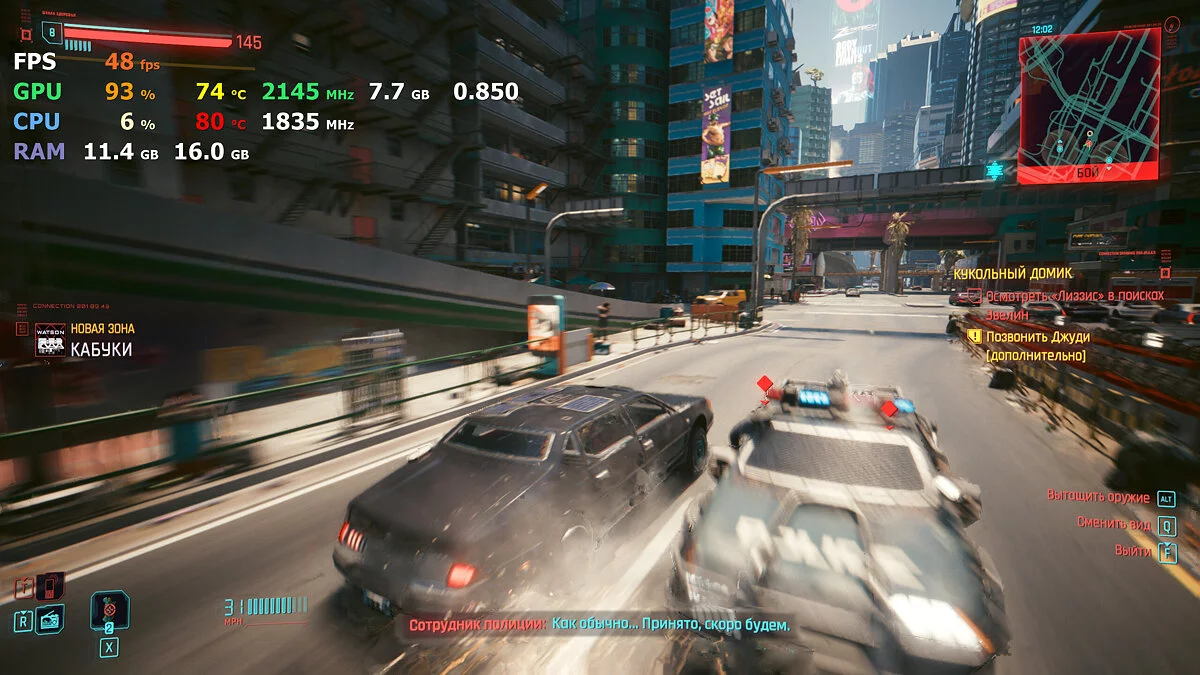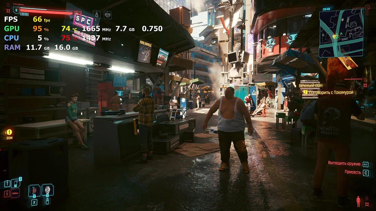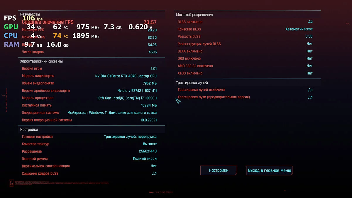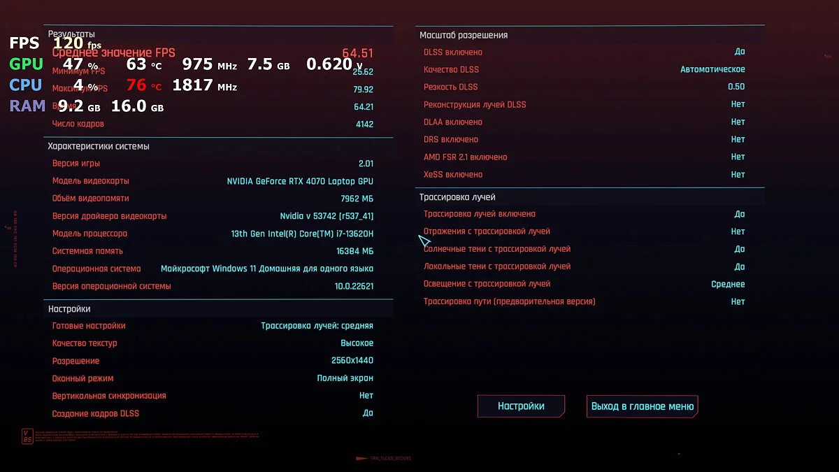 Cyberpunk 2077. Тест проводился в обновлённой версии игры 2.01. С созданием кадров, DLSS, максимальной графикой и трассировкой лучей ультра мы получили 55-60 кадров в секунду. Внутренний бенчмарк показал 64 FPS.