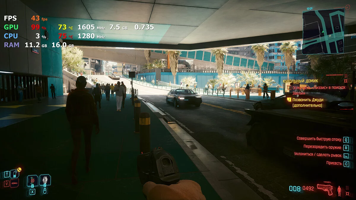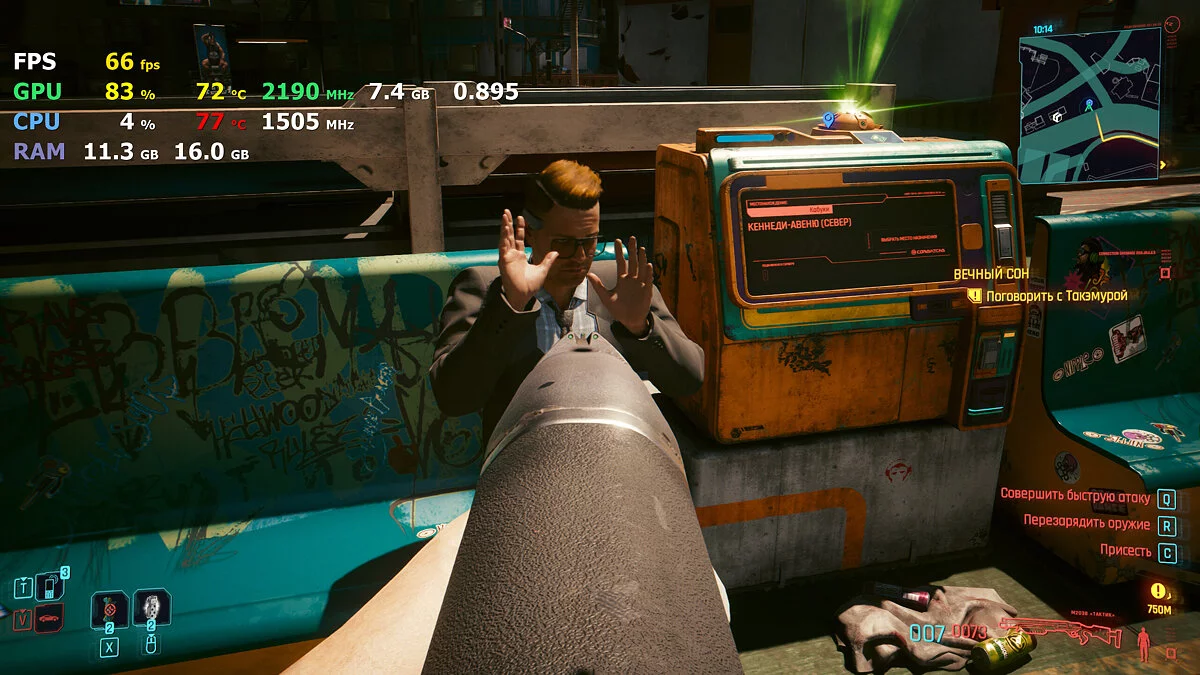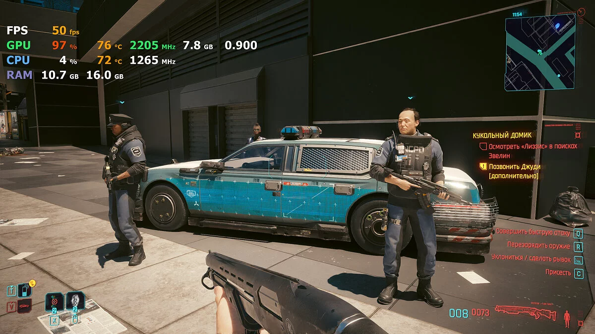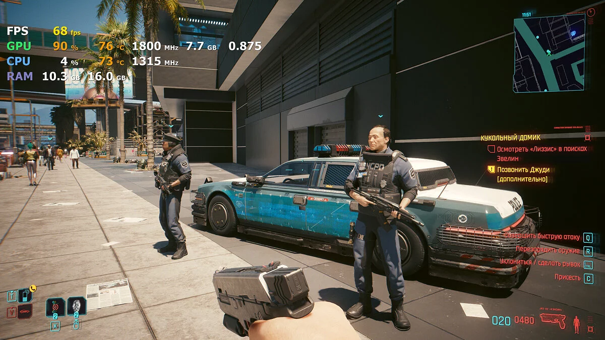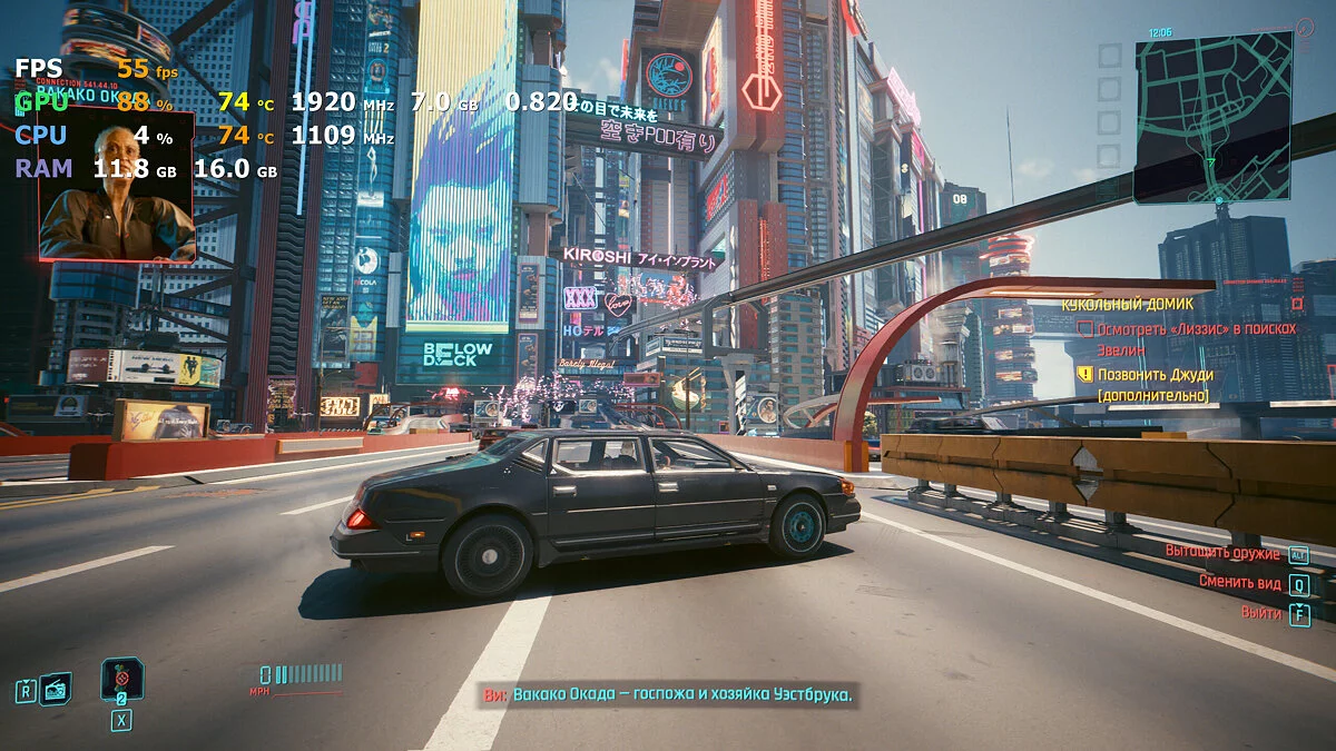 Cyberpunk 2077. Тест проводился в обновлённой версии игры 2.01. С созданием кадров, DLSS, максимальной графикой и трассировкой лучей ультра мы получили 55-60 кадров в секунду. Внутренний бенчмарк показал 64 FPS.