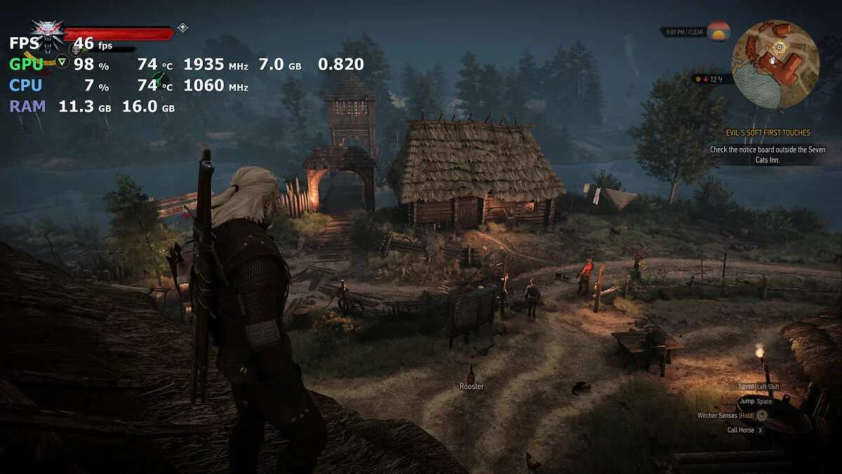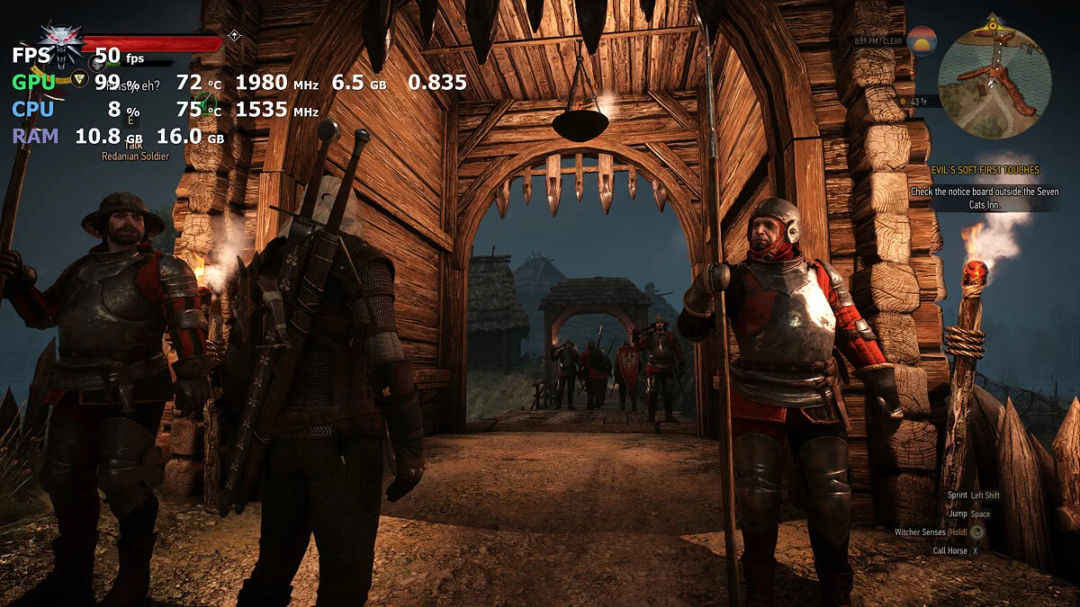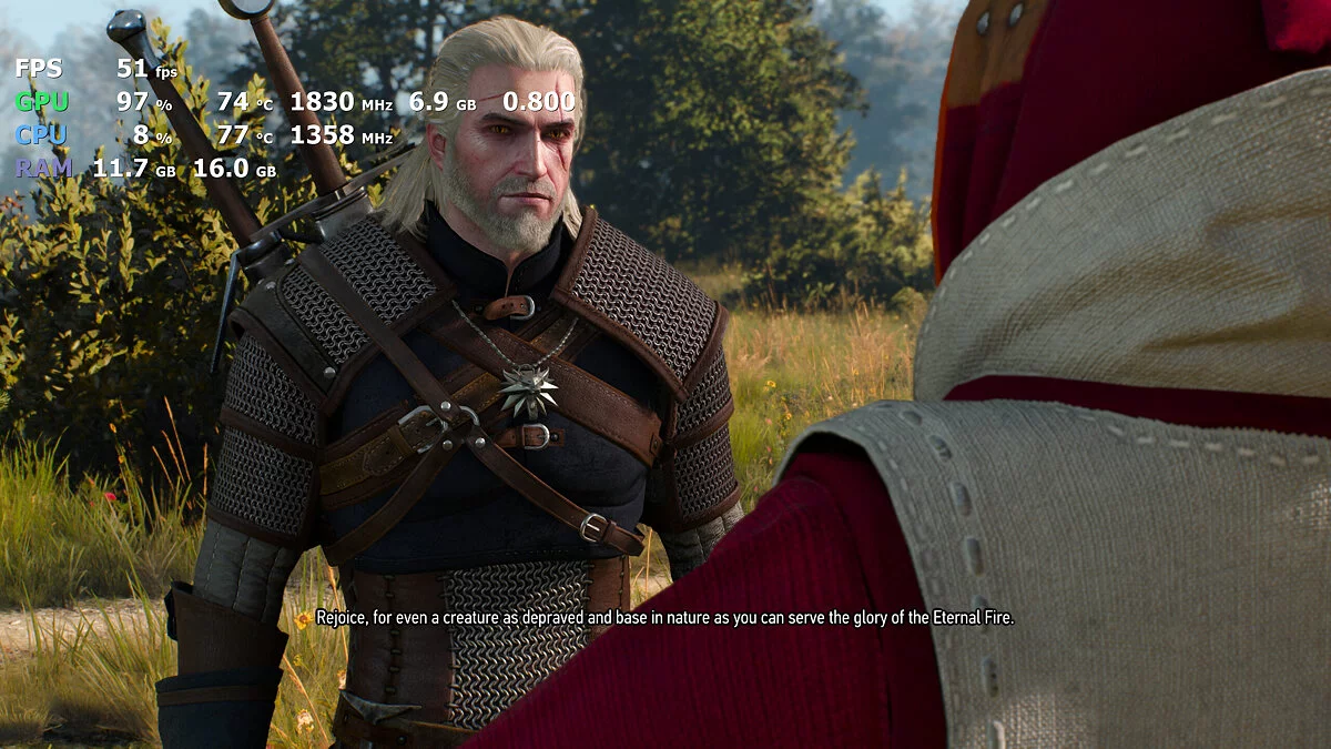 The Witcher 3. Ультра-настройки и максимальная трассировка лучей, только 50 кадров в секунду, поэтому для стабильных 60 FPS понадобится слегка пожертвовать детализацией.