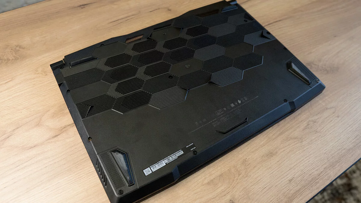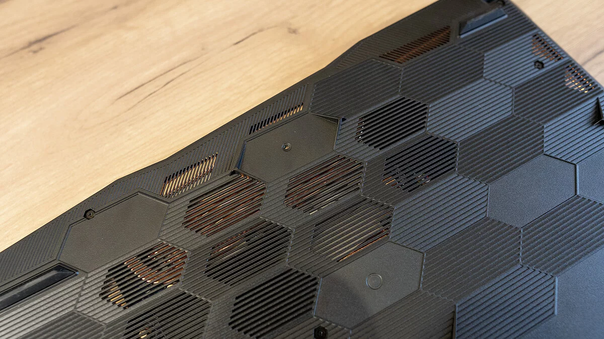 На днище ноутбука расположены продолговатые ножки и вентиляционные отверстия в форме сот. Через них можно увидеть систему охлаждения Cooler Boost 5 с общими тепловыми трубками Shared-Pipe для процессора и видеокарты. Здесь происходит забор холодного воздуха. Выдув — на задней части и слева ближе к дисплею.
