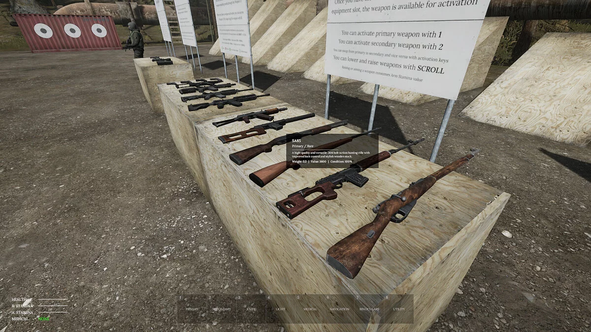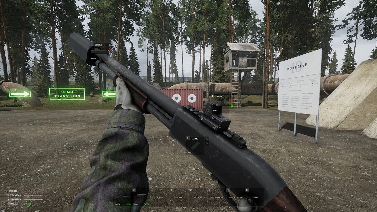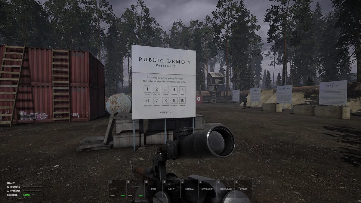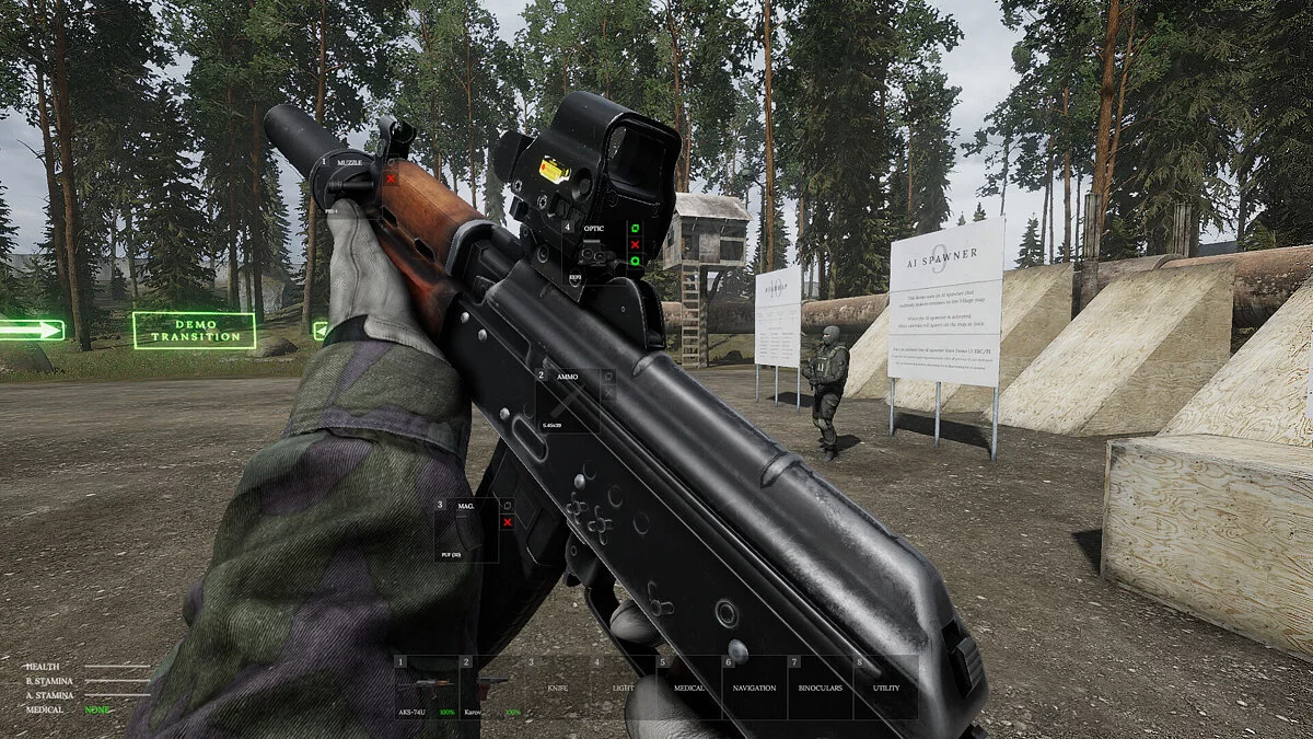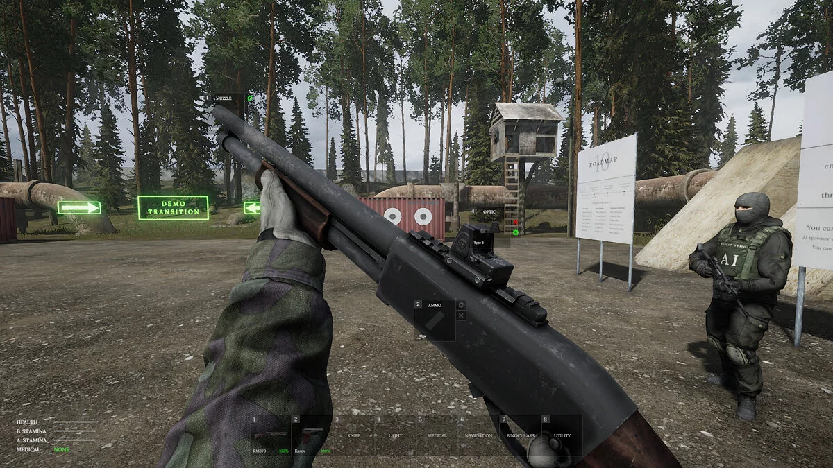 На стрельбище разработчик с помощью стендов рассказывает нам об изменениях в новой демке и объясняет механики игры. По сравнению с первым демо в игре обновилась система инвентаря и экипировки, добавилась система обвесов, зимний облик локаций, а множество механик было переработано и доведено до ума.