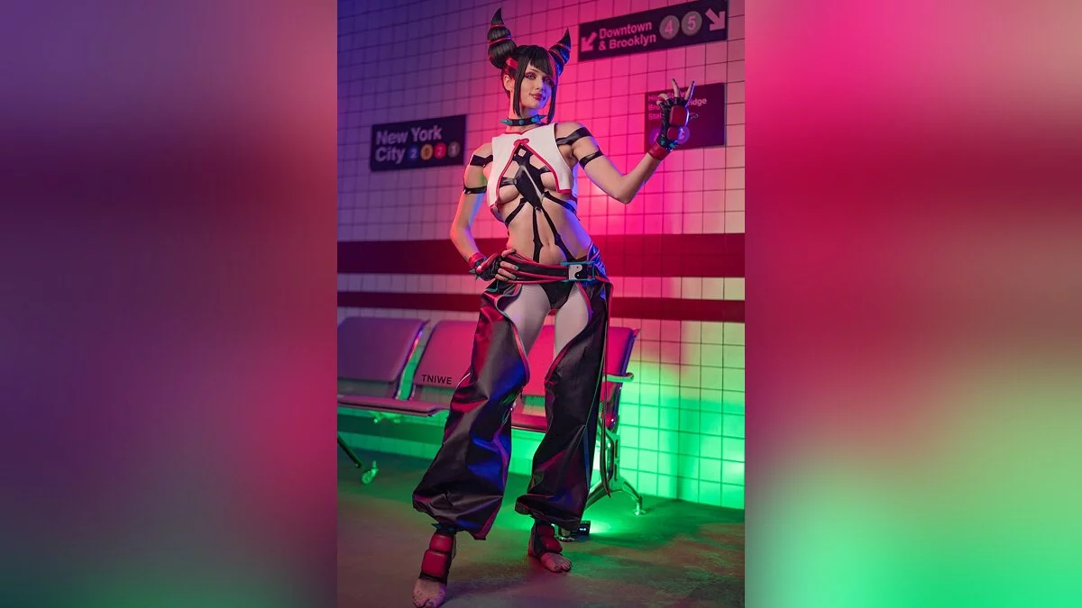 В мире Street Fighter Джури Хан — циничная и жестокая злодейка. В частности, ей доставляет удовольствие причинять боль другим людям. Но одолеть её сложно — благодаря боевым искусствам, девушка может справиться с целым отрядом вооружённых солдат. Косплей на Джури сделала Tniwe.