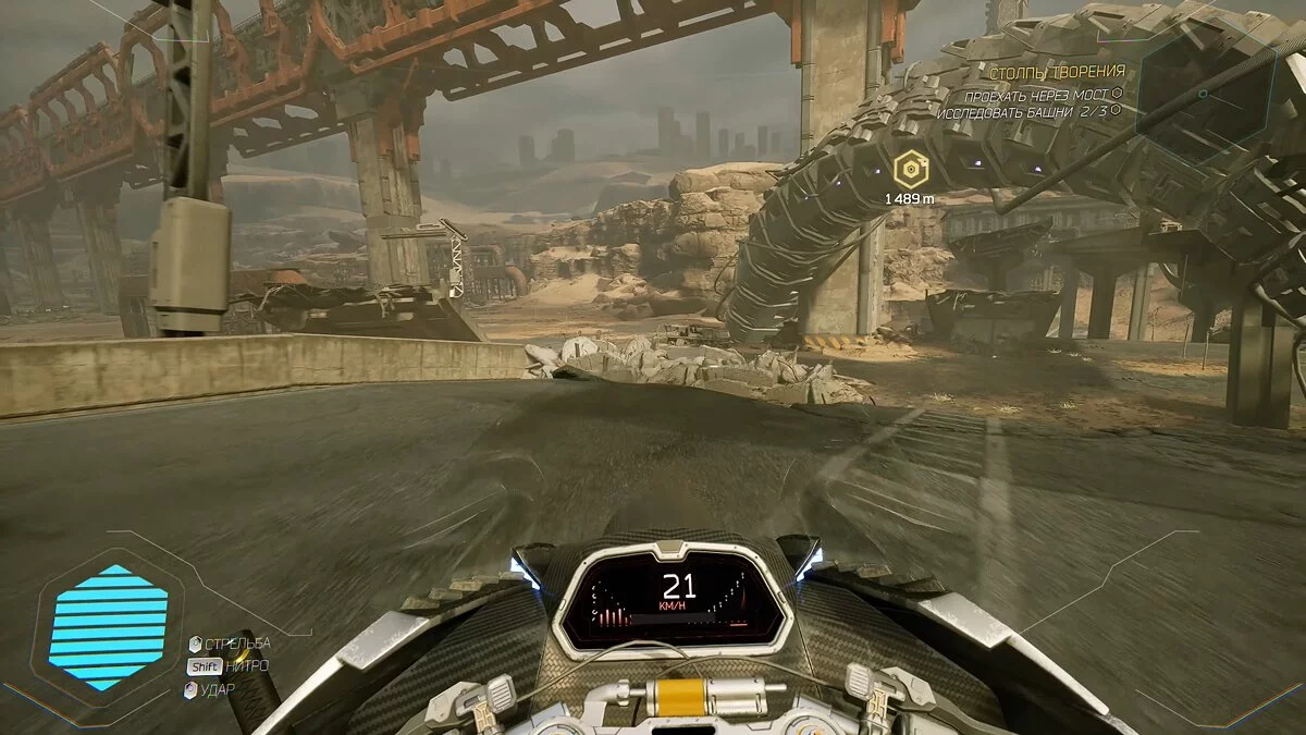 Пустошь реализована в формате полуоткрытого мира, в котором скоростной темп Ghostrunner 2 заметно просаживается. Важно понимать, что по геймдизайнерской структуре проект не приспособлен к открытым локациям и игровым условностям какой-нибудь Far Cry. Во-первых, перемещаться по миру можно строго по расчерченным дорогам, так как местный мотоцикл не умеет нормально ездить по бездорожью. Во-вторых, в открытом мире решительно нечего делать в отрыве от сюжетных миссий. Коробки-аванпосты быстро приедаются и начинают отдавать копипастой. В-третьих, после ошеломительной поездки из вступительной главы, вас забросят в пустынную местность с низкой плотностью событий. Возникает ощущение, словно разработчики намеренно растягивают данный сегмент, чтобы вы как можно больше покатались на крутом байке.